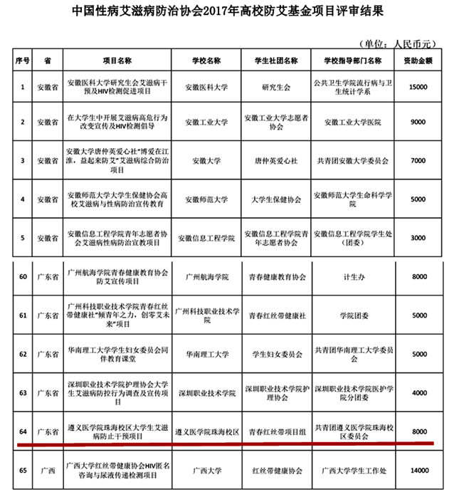 “中国性病艾滋病防治协会2017年高校防艾基金”项目(以下简称“防艾基金项目”)评审结果已于近日揭晓,由校区团委指导申报的《遵义医学院珠海校区大学生艾滋病防治干预项目》成功获得立项资助。
