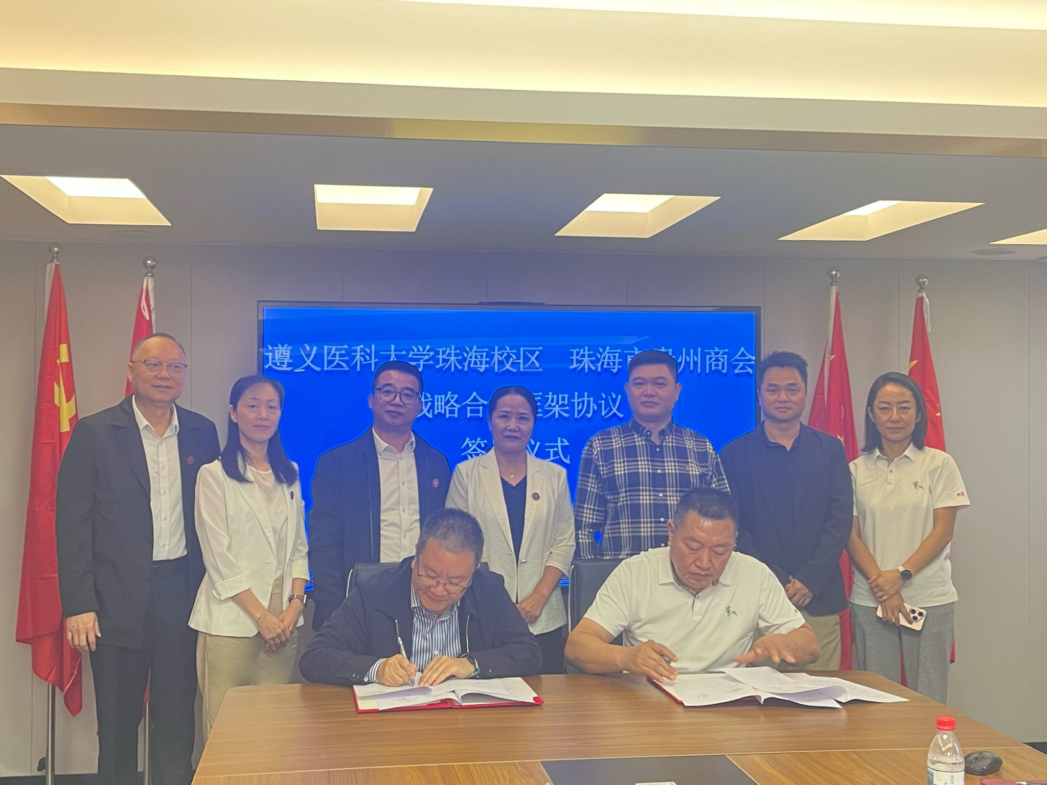2025年10月27日上午,遵义医科大学珠海校区与珠海市贵州商会战略合作框架协议签署仪式在香洲区香华路珠海市贵州商会隆重举行,珠海市贵州商会会长李朝洪、副会长黄金、遵义医科大学副校长李均出席仪式,秘书长王薇、副秘书长冉伟等商会代表及珠海校区党委原副书记向国惠、校方职能部门负责人共同参与。仪式由珠海市贵州商会秘书长王薇主持。