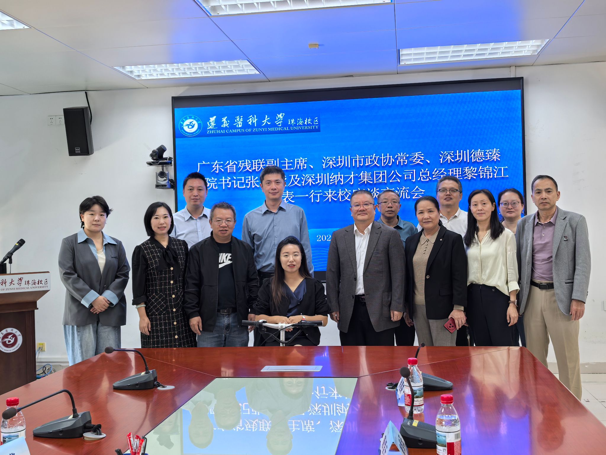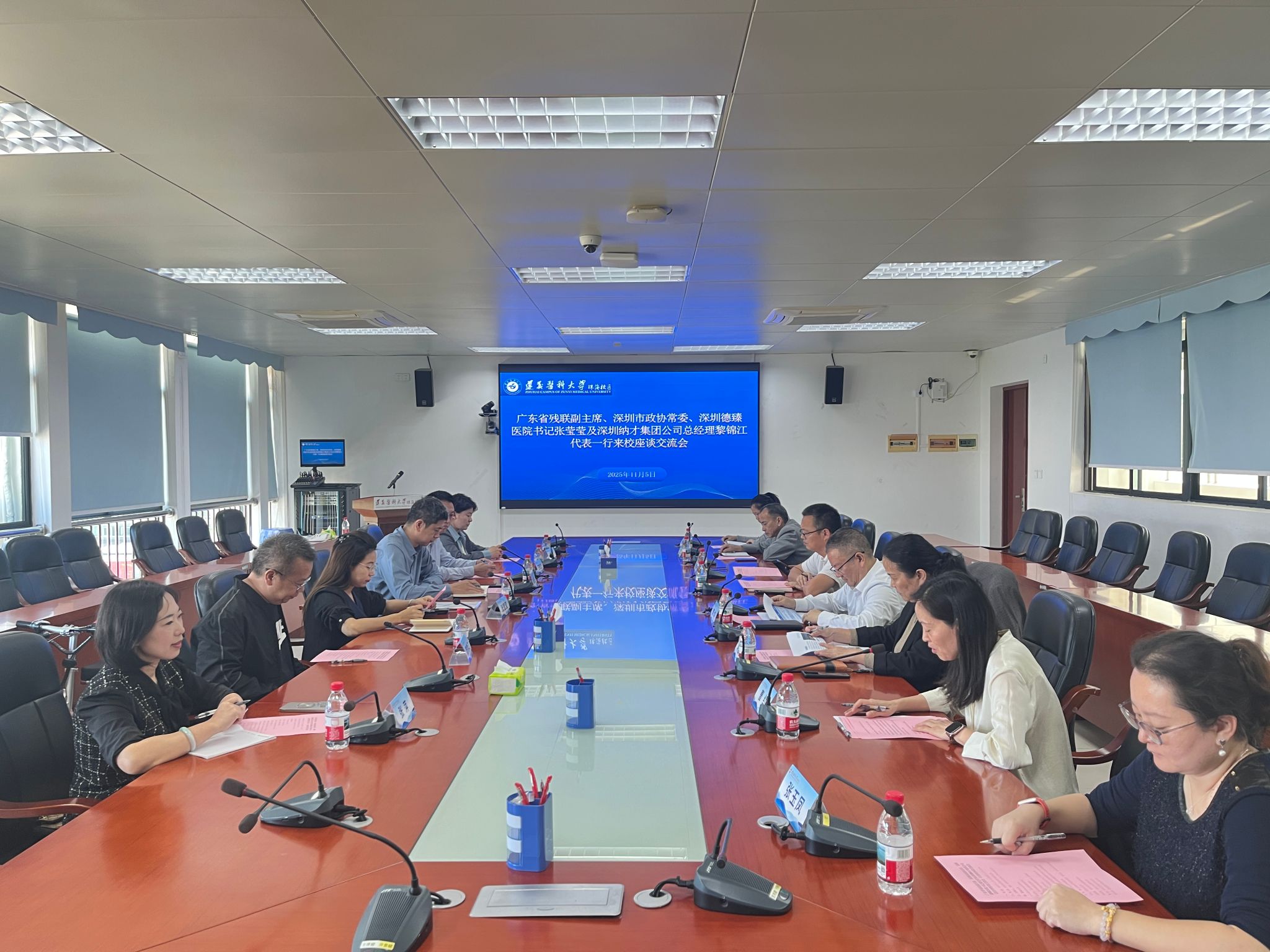 为进一步深化校企协同育人机制,搭建人才培养与就业创业的优质对接平台,推动医疗健康领域与人才服务产业深度融合,2025 年 11 月 5 日上午,广东省残联副主席、深圳市政协常委、深圳德臻医院书记张莹莹,深圳纳才人才信息咨询服务有限公司总经理黎锦江携相关企业代表一行,专程赴遵义医科大学珠海校区开展座谈交流。学校党委常委、副校长、珠海校区党委副书记、管委会主任李均,珠海校区党委原副书记向国惠出席座谈会,校区党政办、学生工作办公室、基础教学部、护理学系等部门负责人共同参与交流,会议由校区学生工作办公室主任曹红主持。