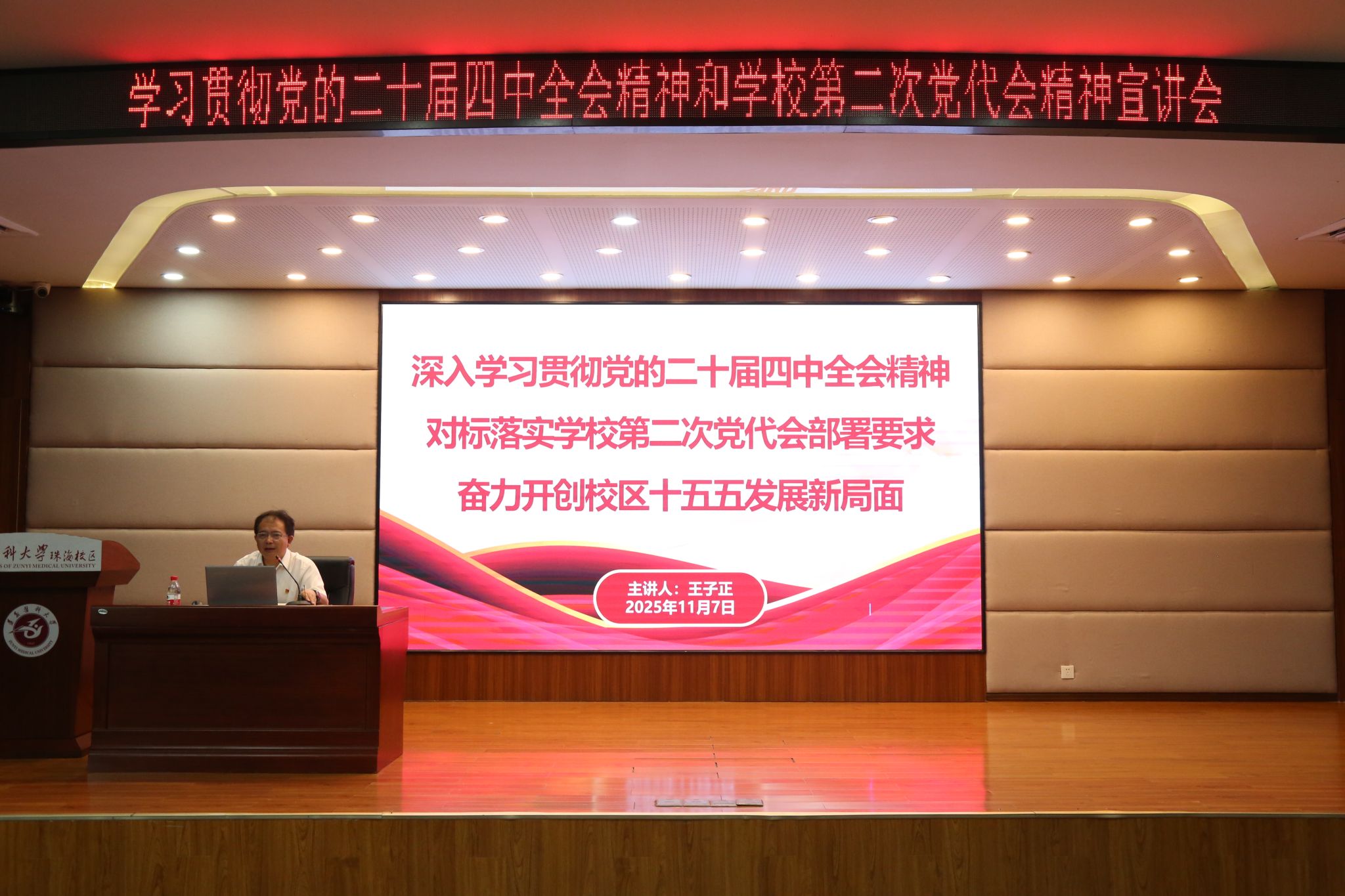 11月7日下午,学校党委副书记、珠海校区党委书记王子正在珠海校区综合楼一楼学术报告厅,面向珠海校区领导、副处级及以上干部、团委、宣传科、保卫科、审计科、对外交流与合作办公室、质量控制科负责人、机关第一党支部、基础教学部教工第一党支部全体党员、各院部系相关负责人,专题宣讲党的二十届四中全会精神与学校第二次党员代表大会精神。