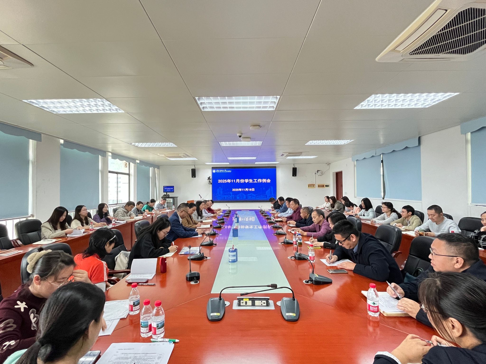 在认真听取与会人员发言后,向国惠结合当前形势和工作实际,对近期学生工作提出三点要求:一是提高政治站位,锚定11月工作核心定位。要将学习宣传贯彻党的二十届四中全会和学校第二次党代会精神作为首要政治任务,深化思想引领;引导学生科学规划课程结课备考、四六级复习及考研冲刺,抓实学业推进;同时筑牢冬季安全防线,重点防范宿舍用电、防寒保暖、交通安全风险,关注学业压力下学生的心理波动,以“时时放心不下”的责任感将“立德树人”根本任务贯穿始终。二是聚焦重点任务,推动学生工作提质增效。要抓实思想引领与学风建设,协同深化“三全育人”格局,促进学生全面发展;加强人文关怀,密切师生联系,主动掌握学生动态、回应诉求,切实解决学生实际困难,以真心换真情提升学生归属感与幸福感;认清就业工作形势,强化协同联动与责任落实,确保就业任务落地;多措并举凝聚家校共育合力,筑牢心理健康与安全防线,防范各类安全事故。三是压实工作责任,凝聚育人工作强大合力。要强化责任落实,各院部系需对照本月工作要点,细化任务、明确分工,确保精准掌握学生思想动态与实际需求;通过开展辅导员培训、案例督导沙龙等活动,促进经验交流、攻克工作难题,切实提升学工队伍业务能力与专业化水平。加强协同联动,各部门及院部系间建立信息共享、快速响应机制,对发现问题及时处置,形成工作闭环。