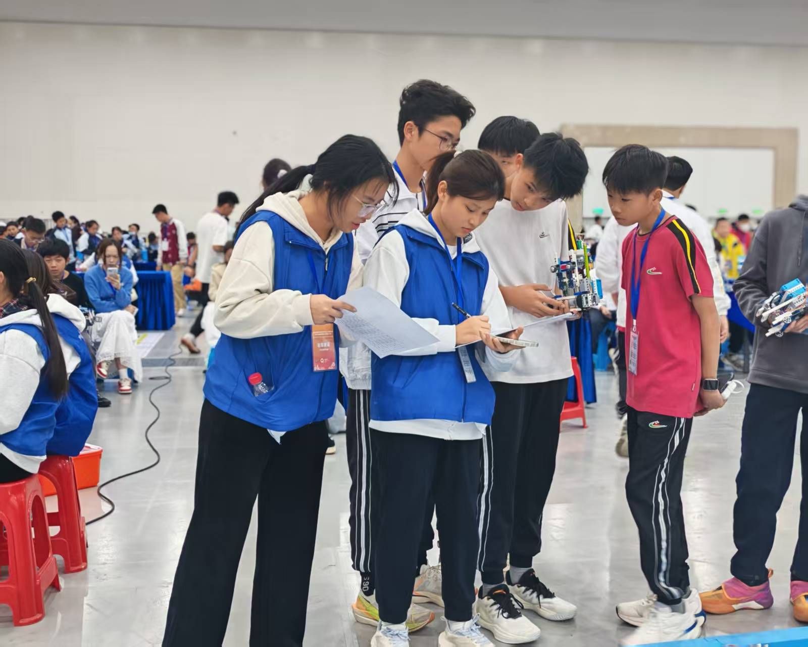 比赛期间,志愿者们分布在裁判、流程协调、分数统计、秩序维护等核心岗位,展现出高度的专业素养与团队协作精神。裁判团队严谨公正,确保比赛评判准确无误;协调组精准把控各环节衔接,保障赛事流畅推进;计分组细致核对数据,维护成绩权威性;秩序组耐心引导现场人员,确保活动安全有序。志愿者们的辛勤付出成为大赛顺利运行的重要支撑,赢得了各方高度认可。