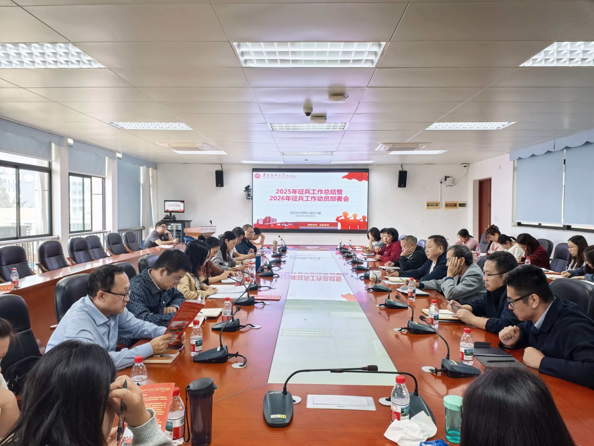 为全面总结2025年征兵工作成效,统筹部署2026年征兵工作任务,12月22日上午,校区在综合楼六楼会议室召开2025年征兵工作总结暨2026年征兵工作动员部署会。校区党委副书记曹红出席会议,学工办、教学办、后勤与设备办、财务与国资办、团委、保卫科等职能部门负责人及相关科室人员,各院部系党委(党总支)书记(副书记)、全体专职辅导员参加会议。