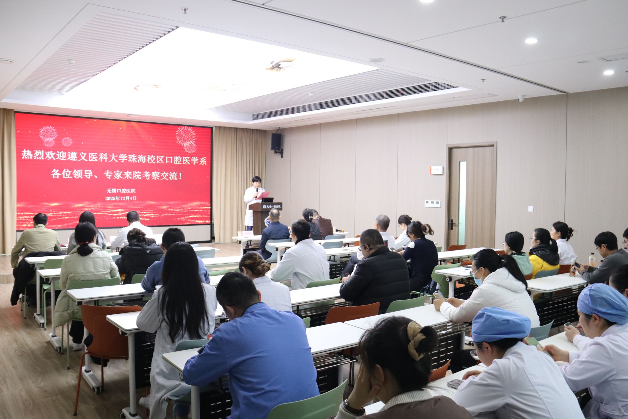 2025年12月22日,校区党委委员、管委会副主任黄桂林,教学督导组组长王春梅,第五附属(珠海)医院副院长、口腔医学系副主任何苇等5人前往无锡口腔医院开展教学交流,并联合举办“3+2”本科人才培养专题教学培训。院校双方领导及教学骨干共同参与此次活动,围绕口腔医学人才培养,通过汇报研讨、实地参观、教学培训等环节进行了深入交流。