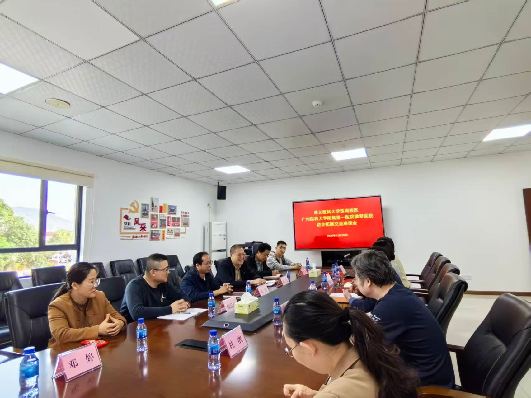 为深入推动党建工作与业务发展相融合,积极拓展毕业生高质量就业渠道,12月29日下午,珠海校区党委委员、管委会副主任秦伟,校区机关第四党支部书记、教学管理办公室副主任林茂率支部党员及相关科室负责人一行7人,赴广州医科大学附属第一医院横琴医院(横琴粤澳深度合作区中心医院)开展党建共建与“访企拓岗”专项交流活动。