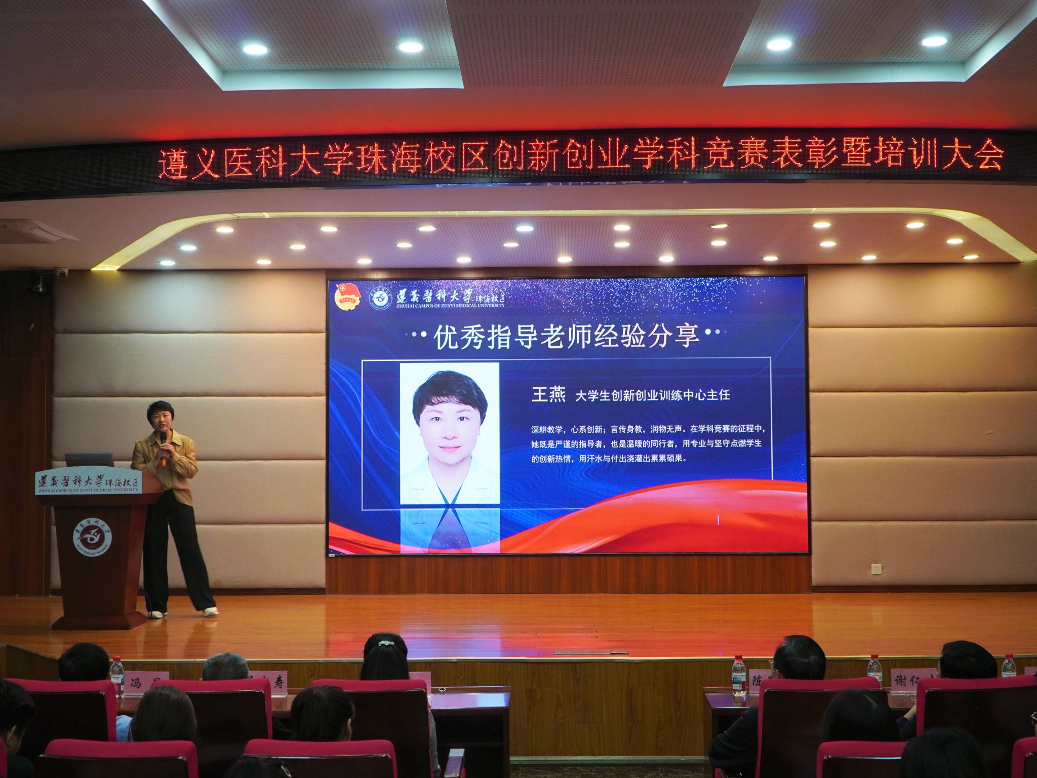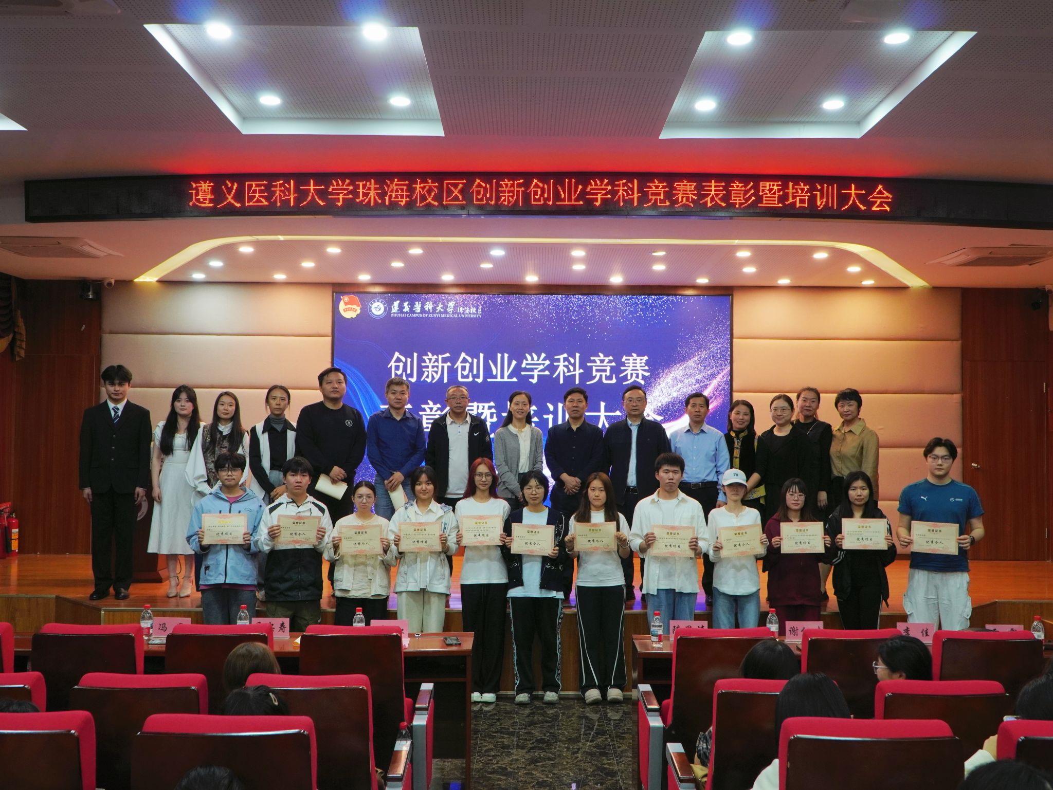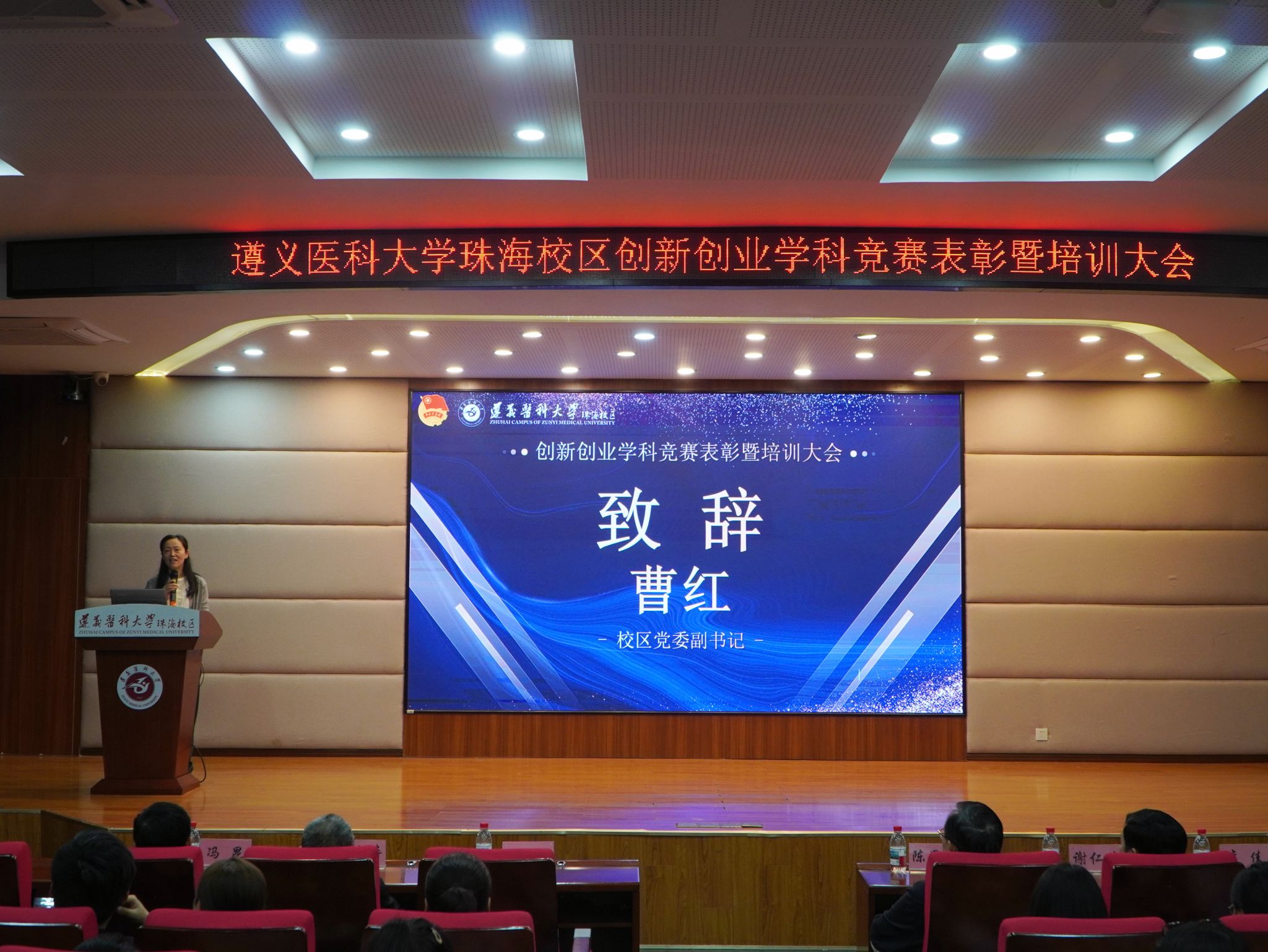 2026年3月17日晚7时,遵义医科大学珠海校区创新创业学科竞赛表彰暨动员大会在综合楼一楼学术报告厅顺利举行。校区党委副书记曹红出席,各院部系主要负责人、创新创业指导教师及参赛团队代表齐聚一堂,共同见证荣誉时刻。