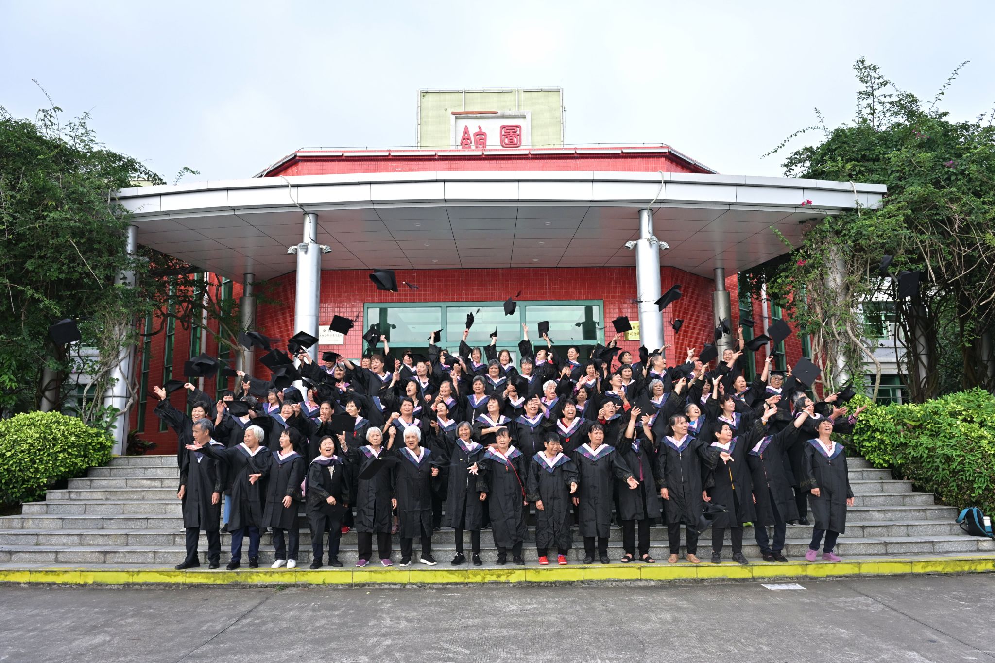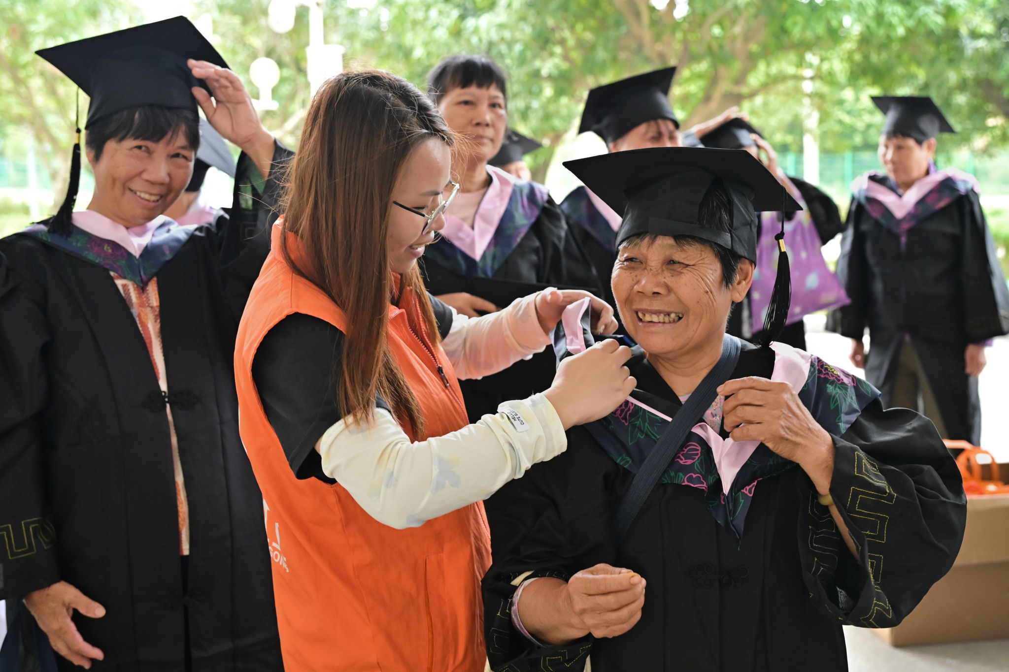 仪式后,长者们身着学士服在校区标志性点位打卡合影,定格美好瞬间;就餐环节,大家围坐畅谈研学收获,共叙邻里同窗情谊。