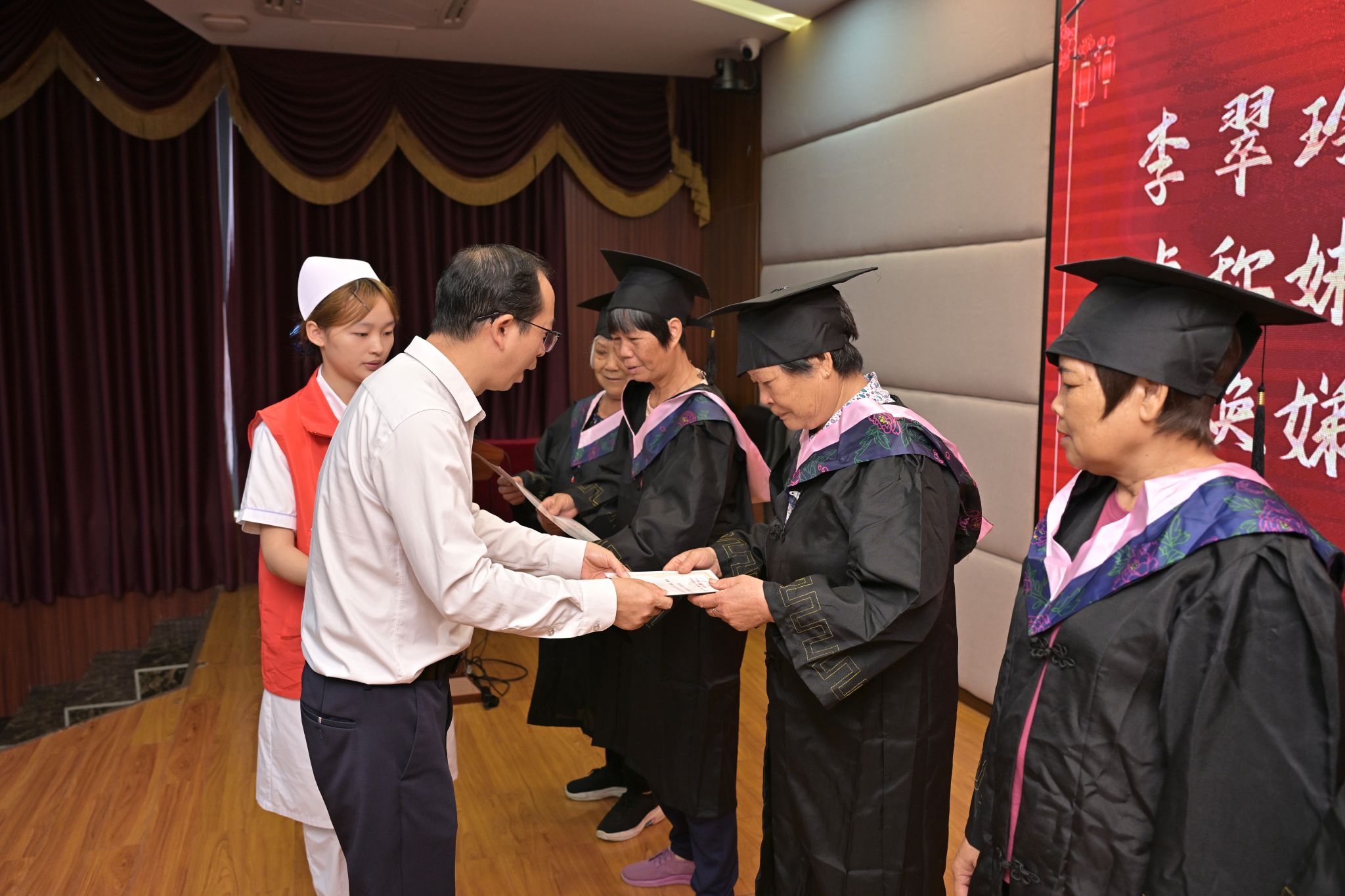 毕业典礼在校区学术报告厅隆重举行,校区党委委员、管委会副主任秦伟参加并致辞,他向顺利毕业的长者致以热烈祝贺,高度赞扬大家老有所学、乐学不倦的精神风貌。证书颁发环节温情满满,长者们依次登台接过毕业证书,脸上洋溢着自豪与喜悦,这不仅是对他们坚持学习的肯定,更是“百千万工程”赋能乡村老年教育的生动实践。