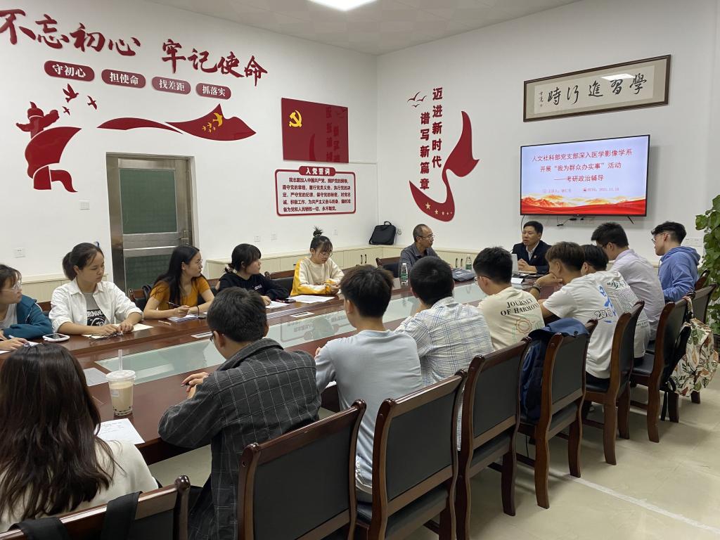 为积极落实“学党史、悟思想、办实事、开新局”,人文社科部党支部深入医学影像学系扎实开展“我为群众办实事”实践活动。11月16日晚上7点,人文社科部党支部组织开展考研政治辅导交流会。医学影像学系2018级学生参加了现场辅导,2017级在外实习的学生通过网络远程参加了辅导交流会。