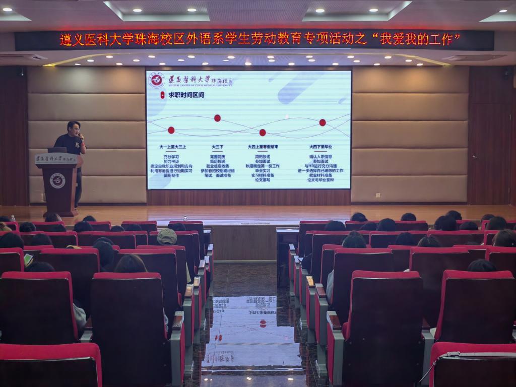 为进一步帮助学生明确职业方向,提高职业生涯规划的意识,增强职业荣誉感和责任感,2023年11月25日晚,由珠海校区学生工作办公室主办,外语系学生党支部承办的学生劳动教育专项系列活动之“我爱我的工作”在综合楼一楼学术报告厅举办。2023届毕业生刘雨霖做了关于个人职业生涯规划的职业交流专题讲座。外语系全体同学到场聆听。