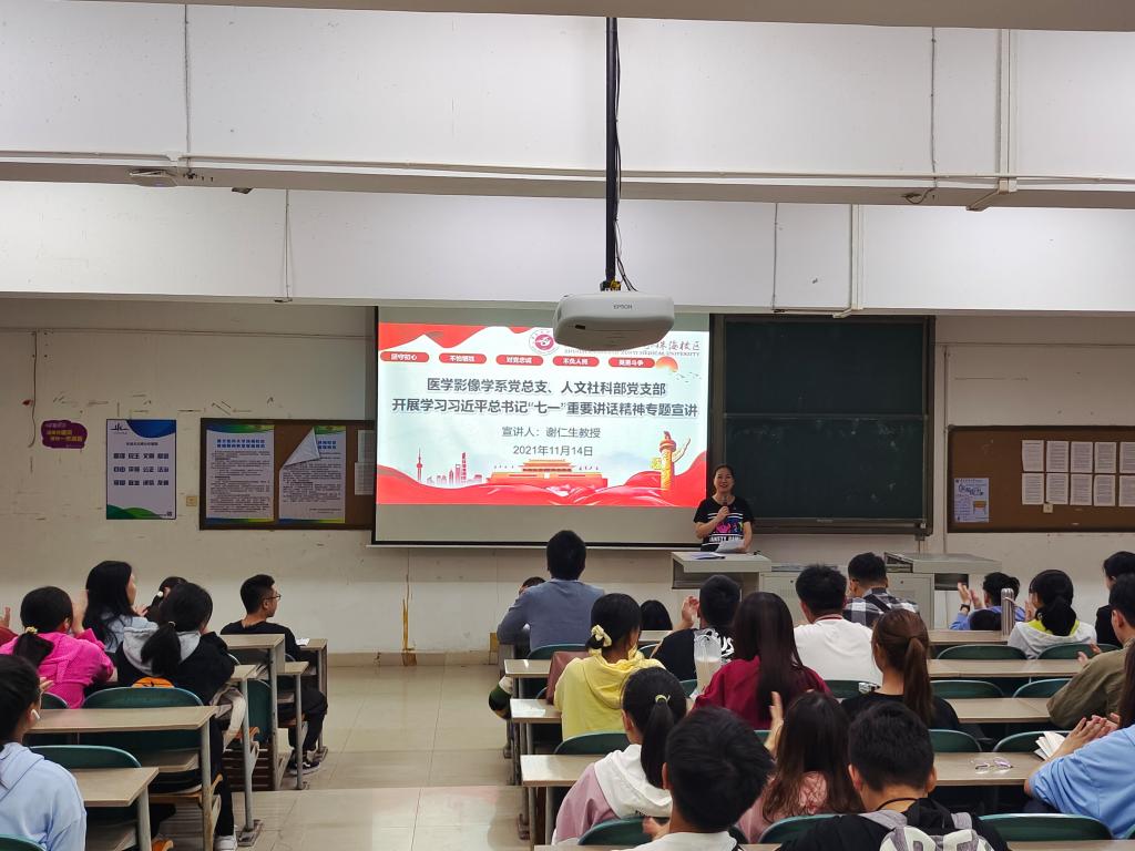 根据贵州省委教育工委和学校党史学习教育工作安排,持续在校园兴起学习宣讲热潮,2021年11月14日晚,校区人文社会科学公共教学部书记谢仁生同志,就深入学习贯彻习近平总书记“七一”重要讲话精神作展示宣讲讲座,医学影像学系党总支书记张燕及医学影像学系、人文社会科学公共教学部全体教职工共200余人参加了本次讲座,讲座由医学影像学系党总支书记张燕主持。