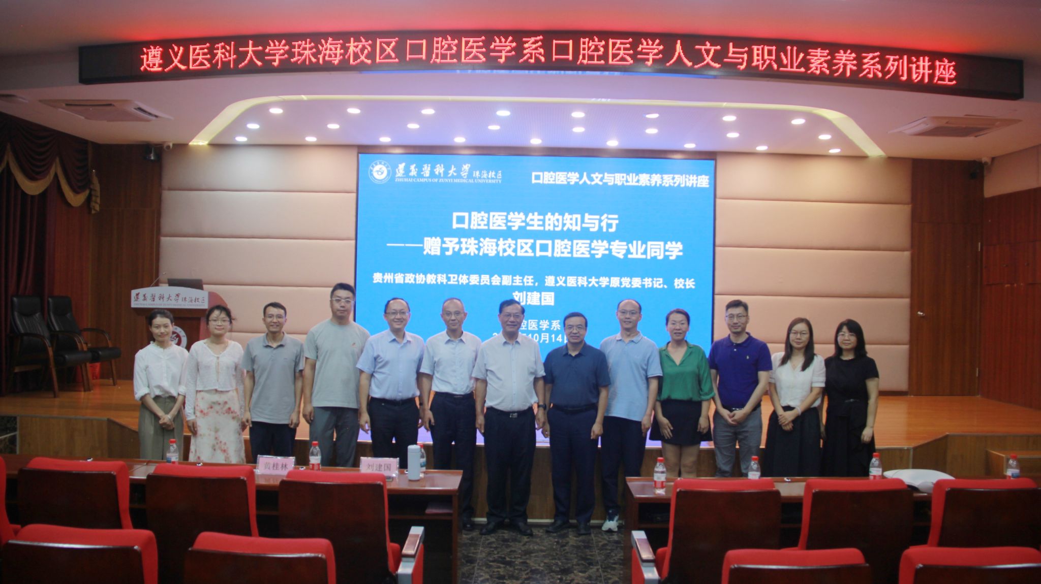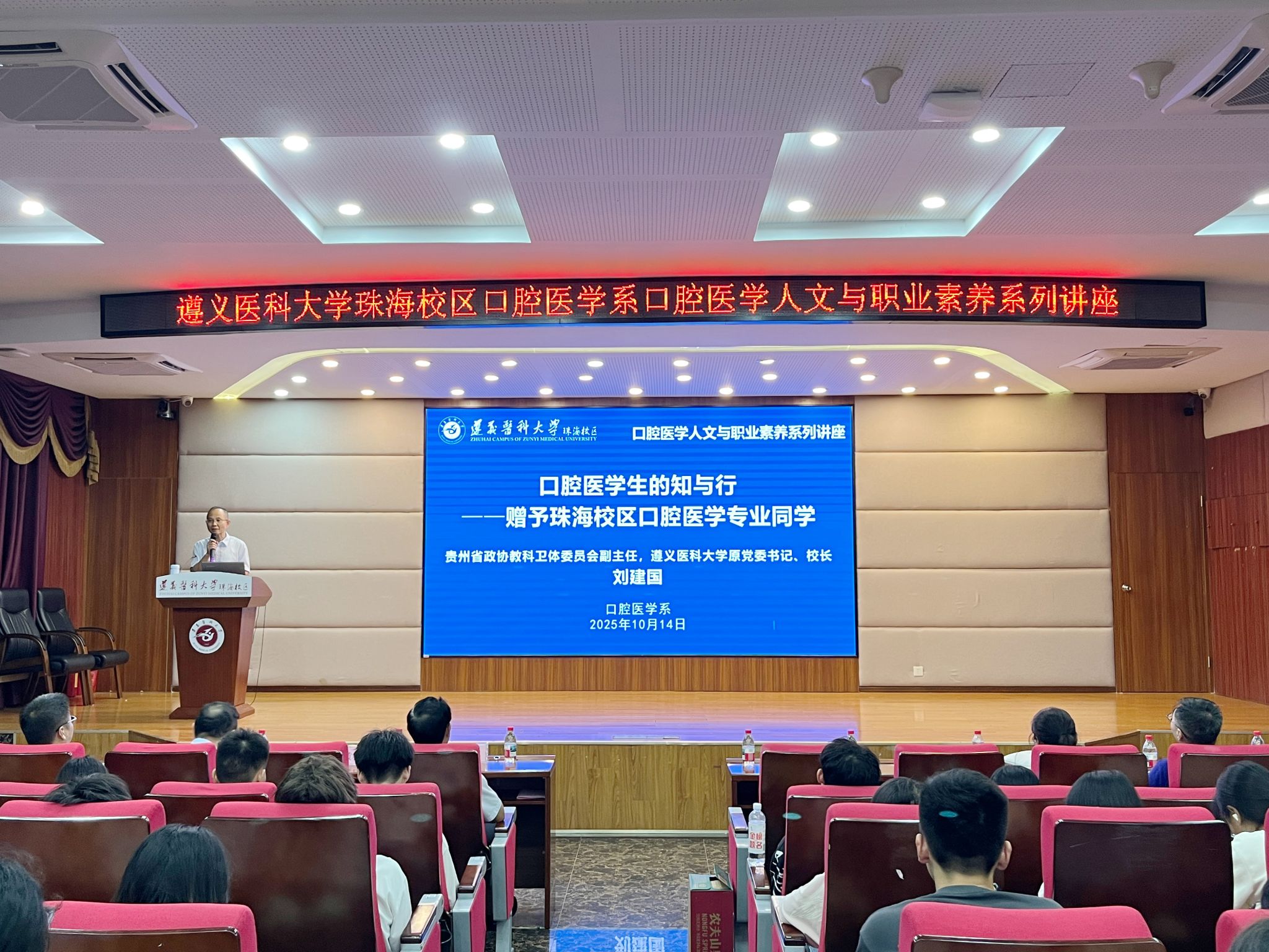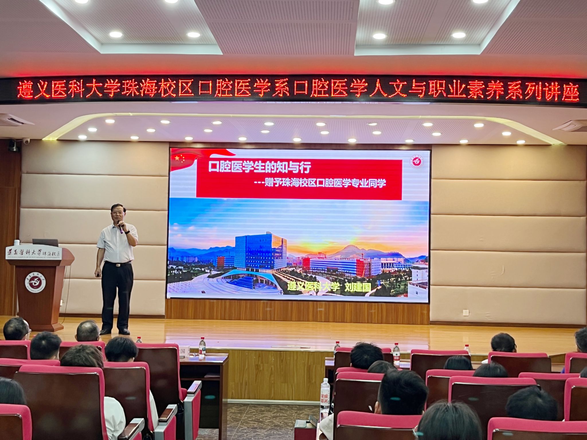 为深入贯彻落实立德树人根本任务,将思想政治教育贯穿医学人才培养全过程。近日,我校口腔医学系成功举办了题为《口腔医学生的知与行》的专题讲座。讲座特邀贵州省政协教科卫体委员会副主任,原遵义医科大学党委书记、校长,我校口腔医学学科带头人刘建国教授担任主讲,校区管委会副主任兼系主任黄桂林教授主持,口腔医学系全体师生共同聆听了这场思想深邃、内容丰富的精神盛宴。