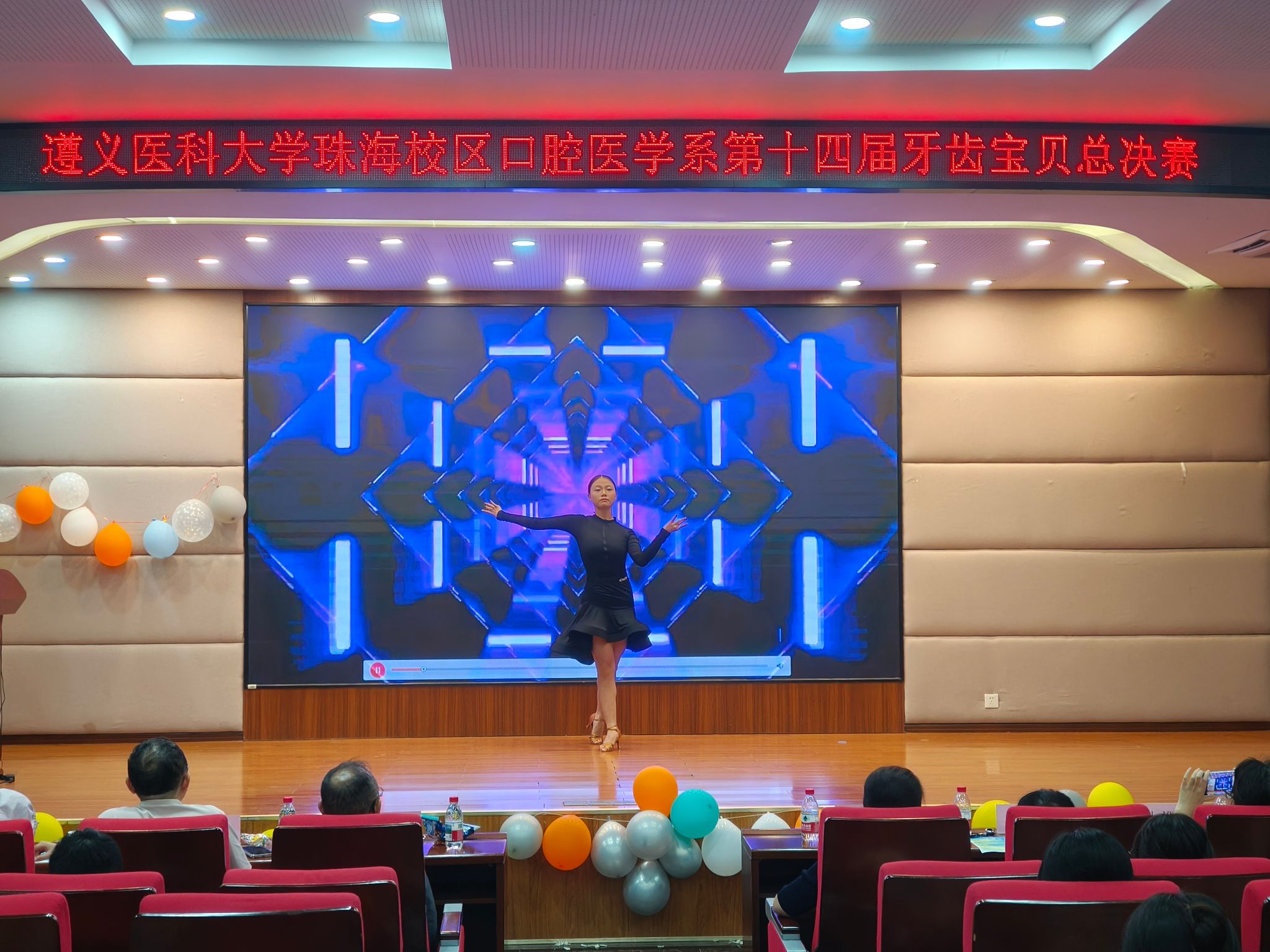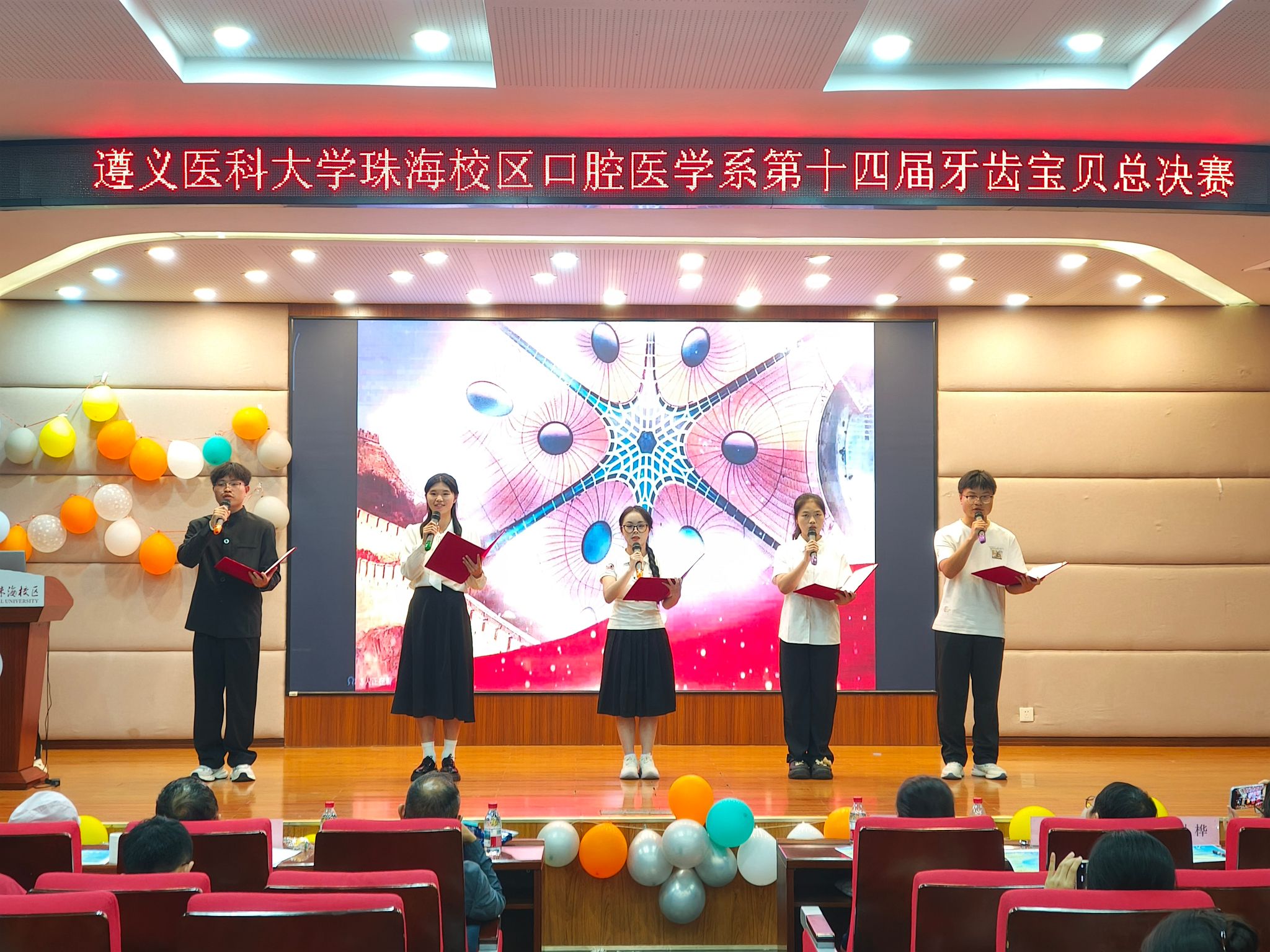 活动伊始,十位参赛选手的自我介绍视频展播后,众人依次上台宣读爱牙宣言,总决赛正式拉开帷幕。表演环节精彩迭出:第一位选手罗雅然独唱《这世界那么多人》,歌声温暖动人;第二位选手罗滢带来单人舞《like Jennie》,动感舞姿点燃全场;第三位选手吴俊江演唱《心墙》,引发台下集体跟唱;第四位选手杨淳婷携伙伴孟月源、郑涵哲、朱家明、姚晨、杨凌煜、汪勇志、吴叙,演绎小品《请假》,以风趣剧情传递职业操守;第五位选手孟月源与王湘湘、高杰、罗点点、陈朝炆合作民族诗朗诵《这盛世如你所愿》,彰显多民族同心情谊;随后 24 级吴明芊、张纯纯献唱《素颜》,甜美元素获观众喜爱;第六位选手凯妍表演拉丁舞蹈《Me too》,展现国标舞魅力;第七位选手何逍遥与谢佳妮、陈铠淇、罗雅然、吴俊江、陈浩龙合唱《青花瓷》,营造古典意境;第八位选手卢虹余带来舞蹈《星空漫游指南》,柔美动作惊艳全场;第九位选手肖诗柔带领陈绮玟、鄢莨洪、张莹荻、陈柔含、任思睿、罗滢、陈楚翼、尹语涵、铁傲雪跳群舞《我的未来式》,尽显青春活力;第十位选手袁彤云及伙伴封建勇、杨宇翔、邓雨佳、邹文洪、张彩芸、张浩东、祖宇乐、张桂枫呈现灯光秀,展现校园时光,触动全场。