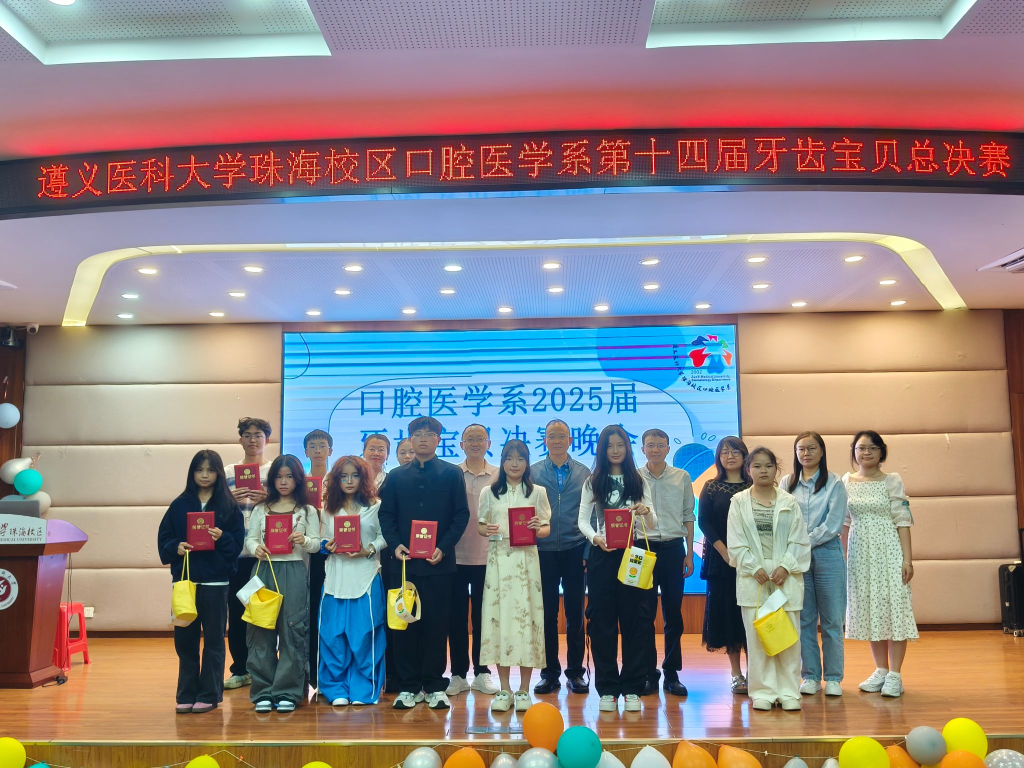 经评委评分,第一位选手罗雅然当选本届“牙齿宝贝”。随着全体师生、参赛选手与工作人员齐聚镜头前合影,珠海校区口腔医学系第十四届“牙齿宝贝”总决赛正式落下帷幕。这场兼具观赏性与教育意义的活动,既充分展现了口腔医学系学子昂扬向上的精神风貌,更通过丰富的文艺形式厚植民族团结情怀,让中华民族共同体意识愈发深入人心,为校园文化的繁荣发展增添了亮丽色彩。【审核:一审岳兴,二审邢希如、李如芸,三审杨泽寅、蒋成东;供稿:珠海校区口腔医学系】