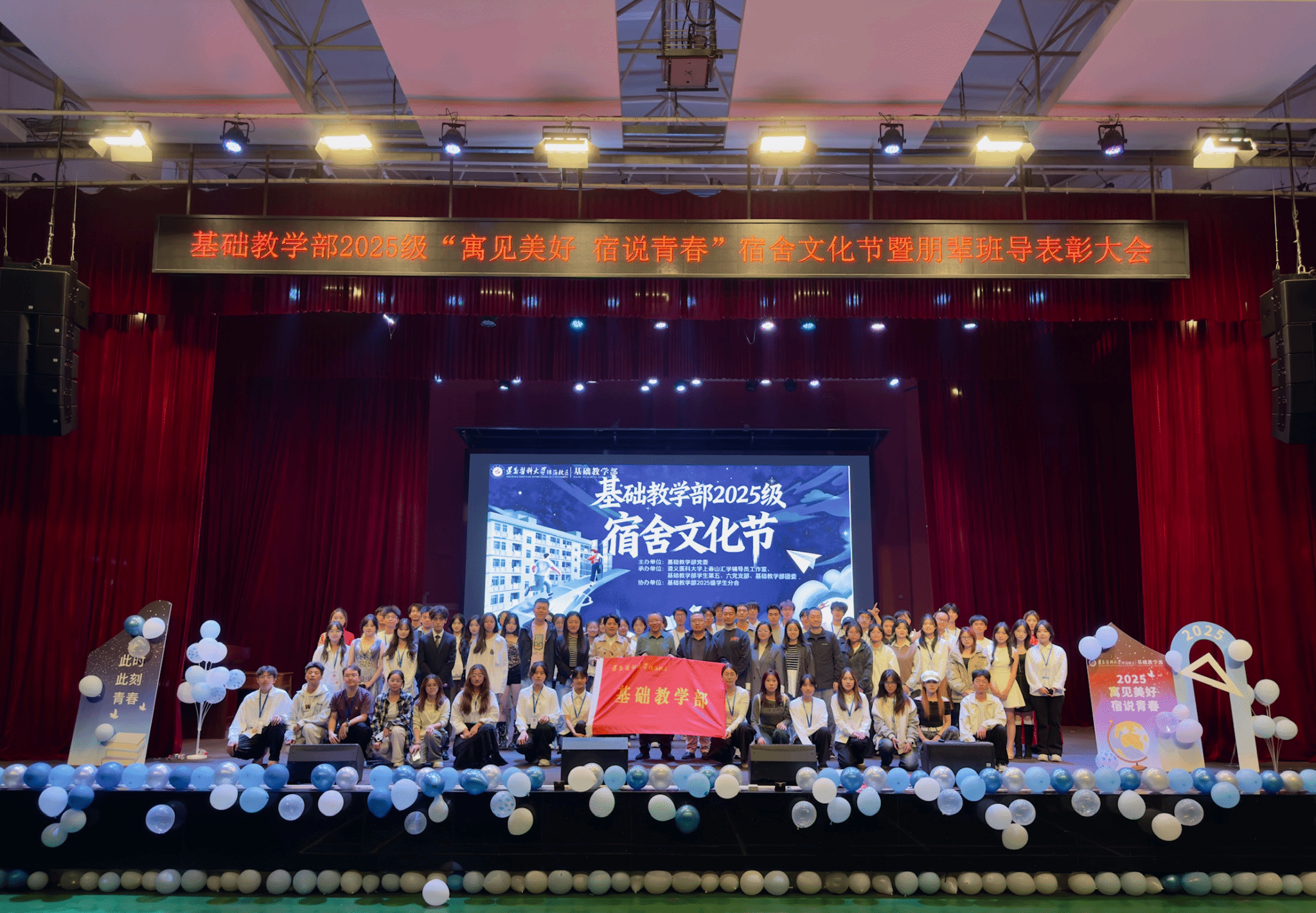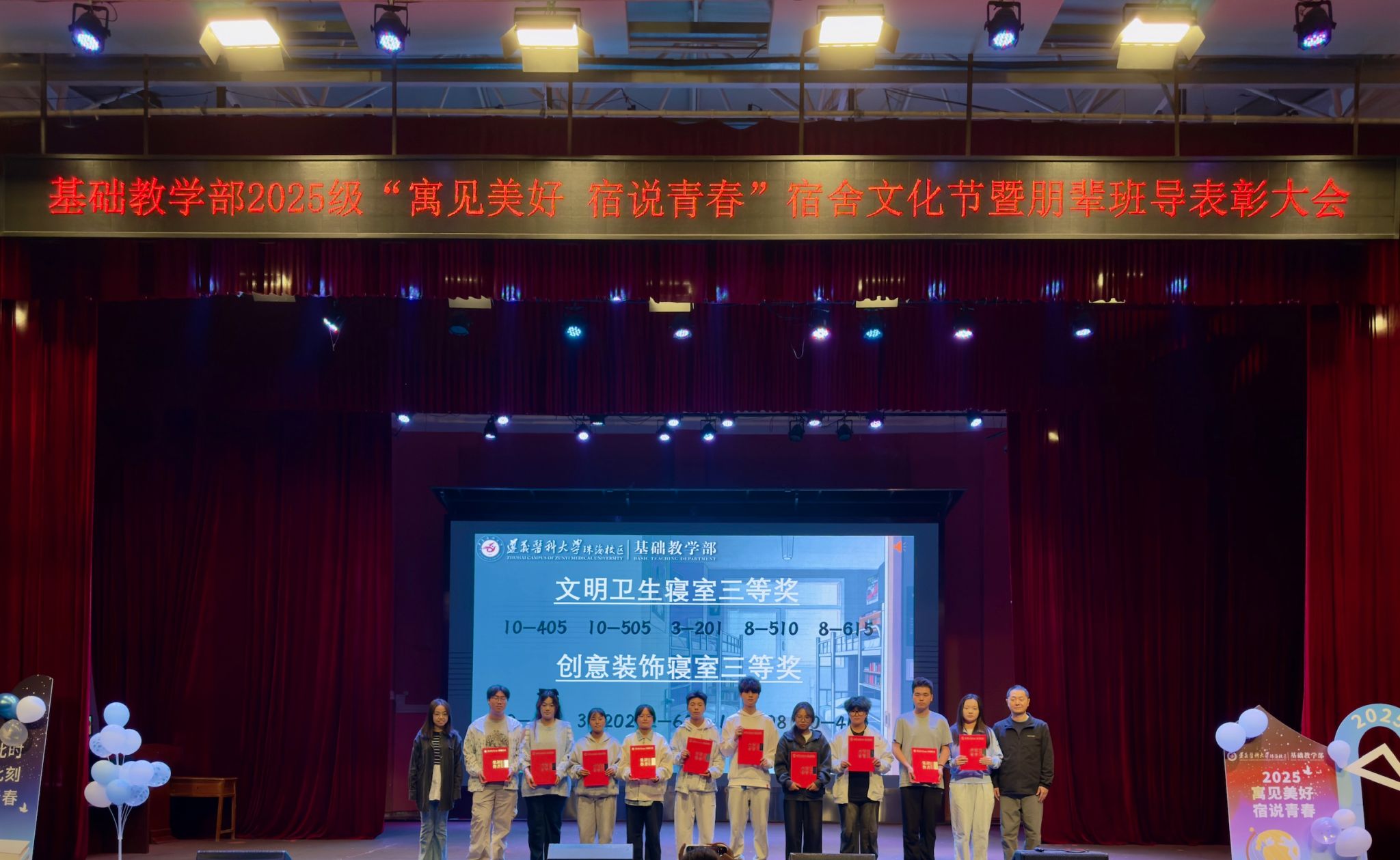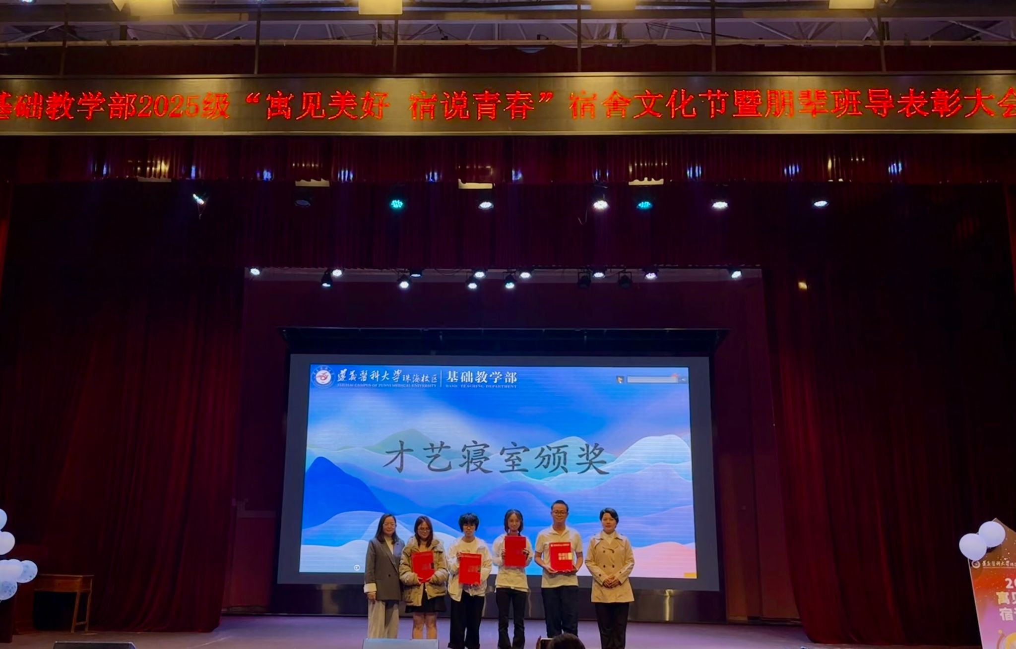 11月30日晚,由基础教学部党委主办的“寓”见美好,“宿”说青春——2025级宿舍文化节总结暨朋辈班导表彰大会在校区大会堂举行。基础教学部党政领导吴忠寿、陈乾雄、陈燕玲,2025级专兼职辅导员、全体朋辈班导以及临床、社体、康复专业全体新生共同参加了本次活动。