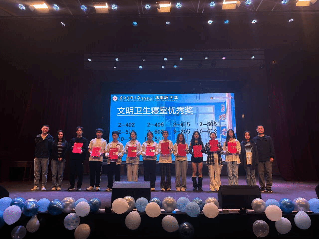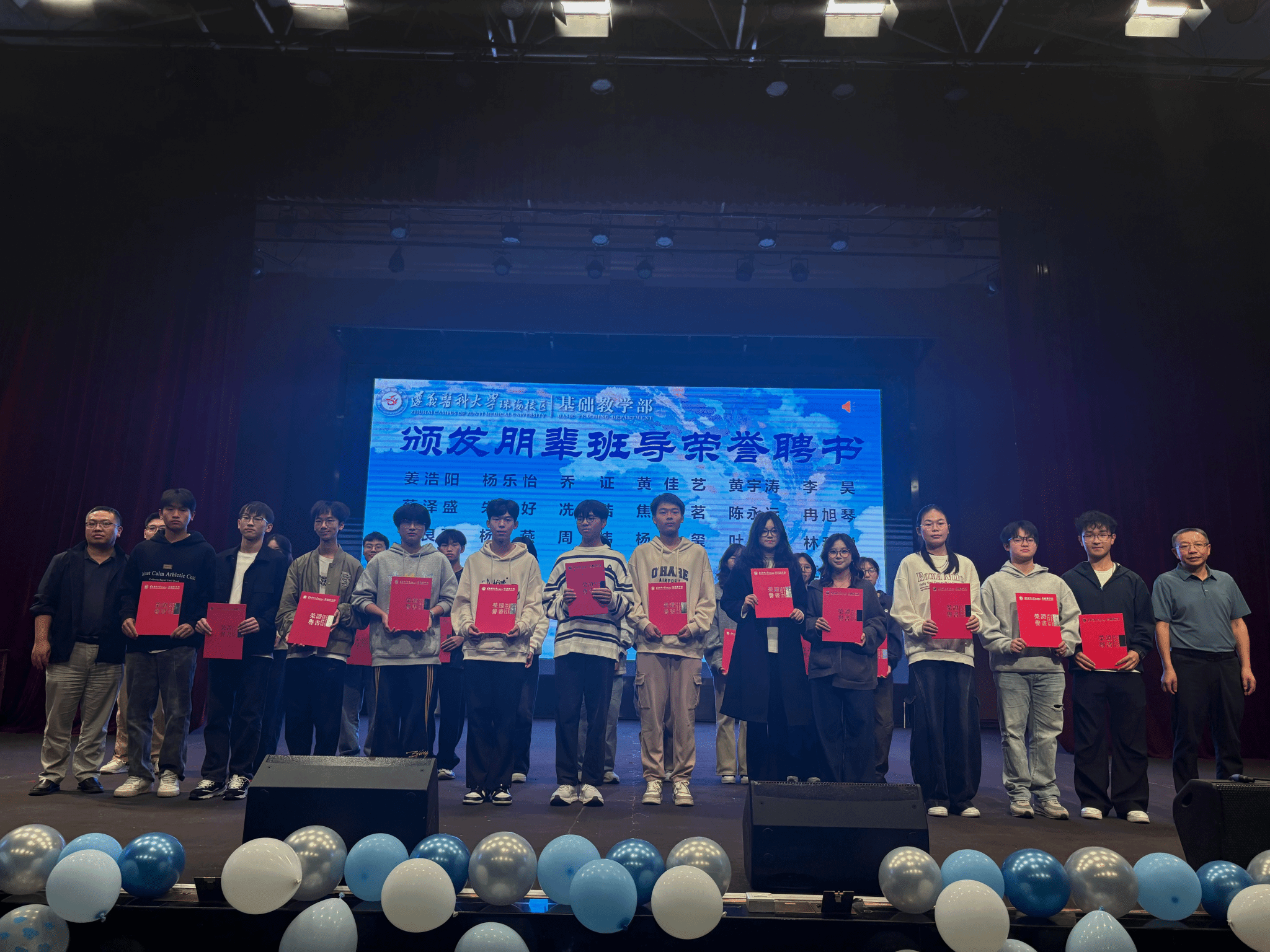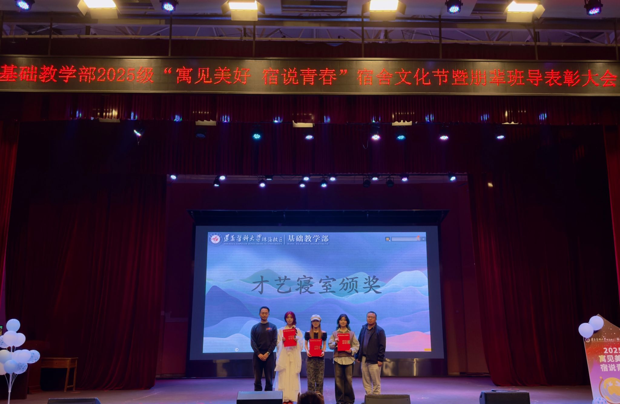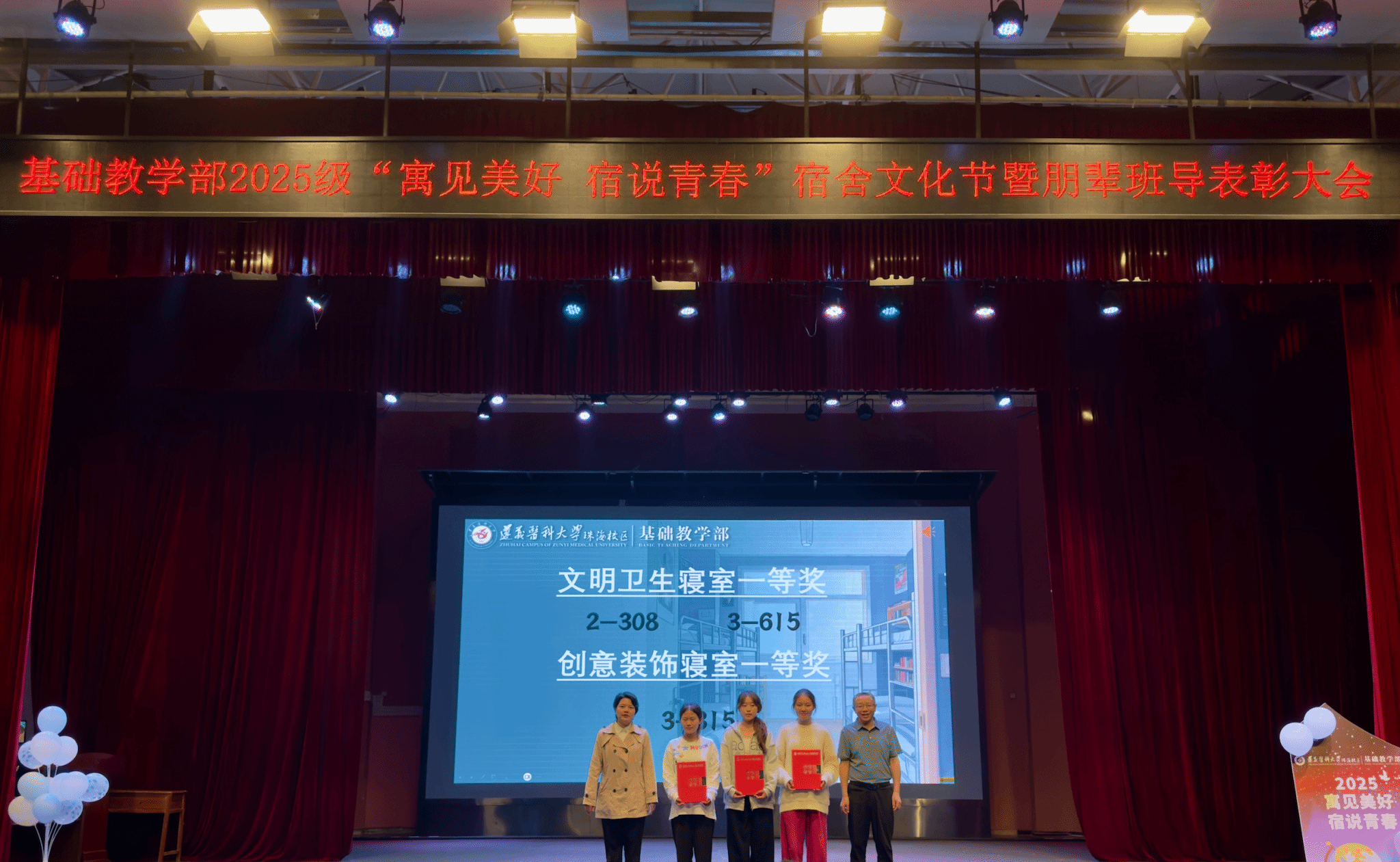 11月30日晚,由基础教学部党委主办的“寓”见美好,“宿”说青春——2025级宿舍文化节总结暨朋辈班导表彰大会在校区大会堂举行。基础教学部党政领导吴忠寿、陈乾雄、陈燕玲,2025级专兼职辅导员、全体朋辈班导以及临床、社体、康复专业全体新生共同参加了本次活动。