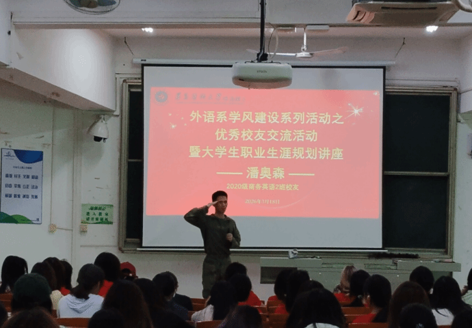 2020级商务英语2班优秀校友潘奥森返校分享应征入伍经历与职业生涯规划心得。身着戎装的他身姿挺拔,结合军旅生涯中的真实故事,讲述在部队克服困难、锤炼意志、实现蜕变的历程。随后,李希开展2025 - 2026学年第一学期商务英语专业学情分析,全面梳理上一阶段学习情况,精准指出存在问题与改进方向,并依次对校级一、二、三等奖学金、三好学生、优秀学生干部、学习优秀奖学金、优秀共青团员、优秀团干部及优秀先进班集体等获奖个人与集体进行表彰,激励全体同学以先进为标杆,勤学笃行、奋勇争先,随后主持新学期学风建设启动仪式。最后,时勇鹏围绕网络安全开展专题教育,强调网络安全的重要性,提醒全体学生提高防范意识,自觉抵制网络风险,守护个人信息与财产安全。