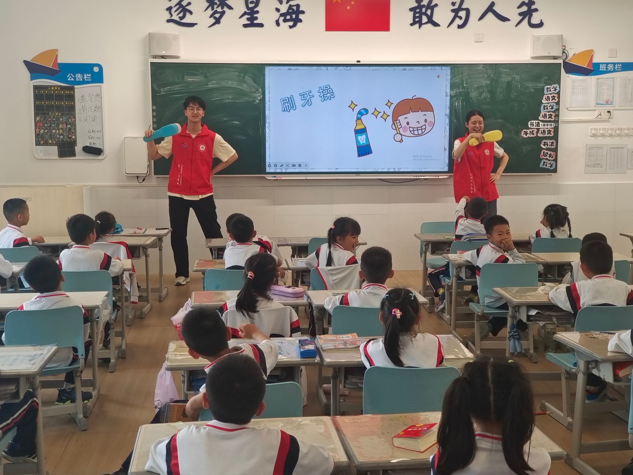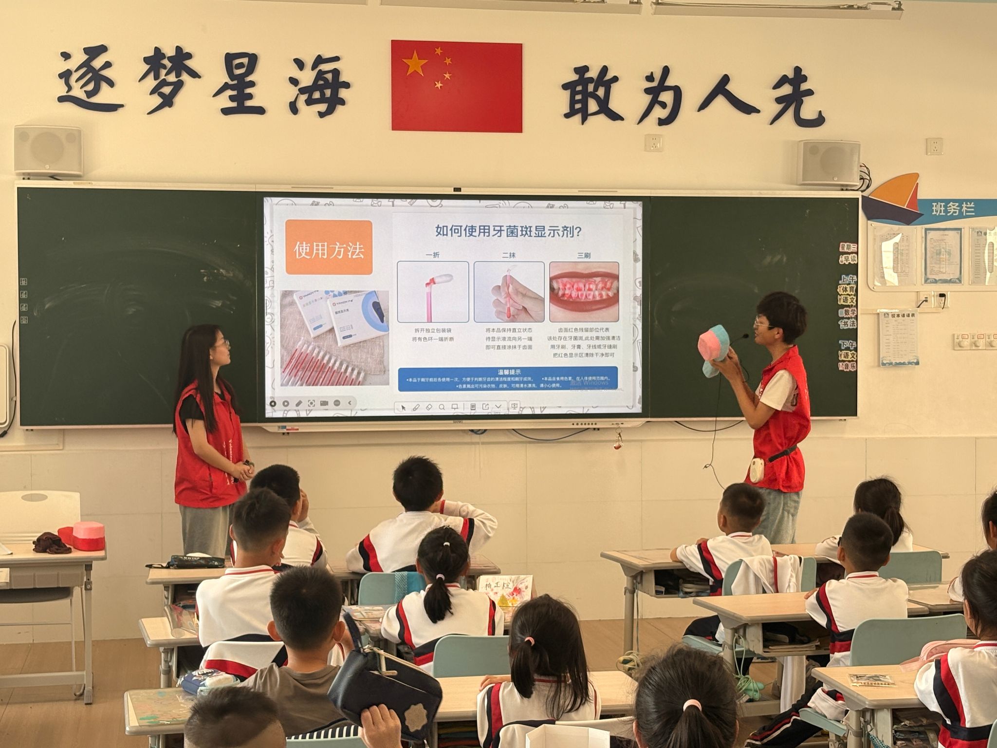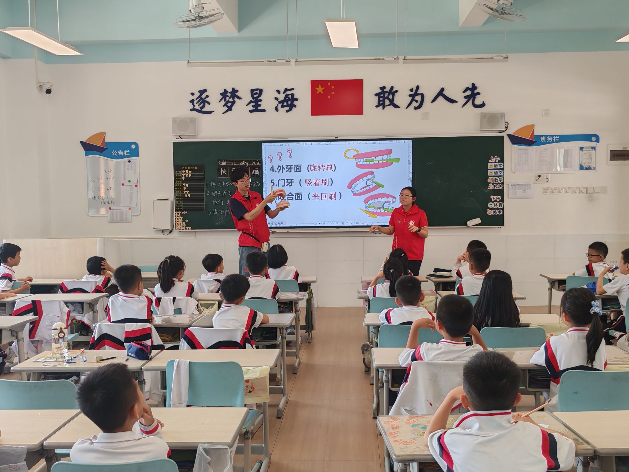 2026年3月25日,“口腔健康宣教之牙菌斑大作战”志愿服务活动在珠海市第一中学附属金湾学校顺利开展。活动由团金湾区委、遵义医科大学珠海校区团委主办,滨海社区团支部、遵义医科大学珠海校区口腔医学系团委、口腔医疗志愿服务队、珠海一中附属金湾学校联合承办,滨海社区团支部副书记周嘉怡、后备干部黄瑾、口腔医学系团委指导老师刘桦、珠海一中附属金湾学校小学部一年级级长申变变带队,23名校区口腔医疗志愿者,为该校一年级4个班级183名学生带来生动实用的口腔宣教服务。