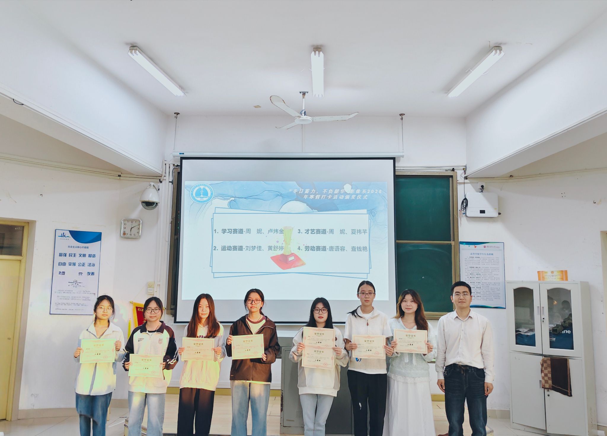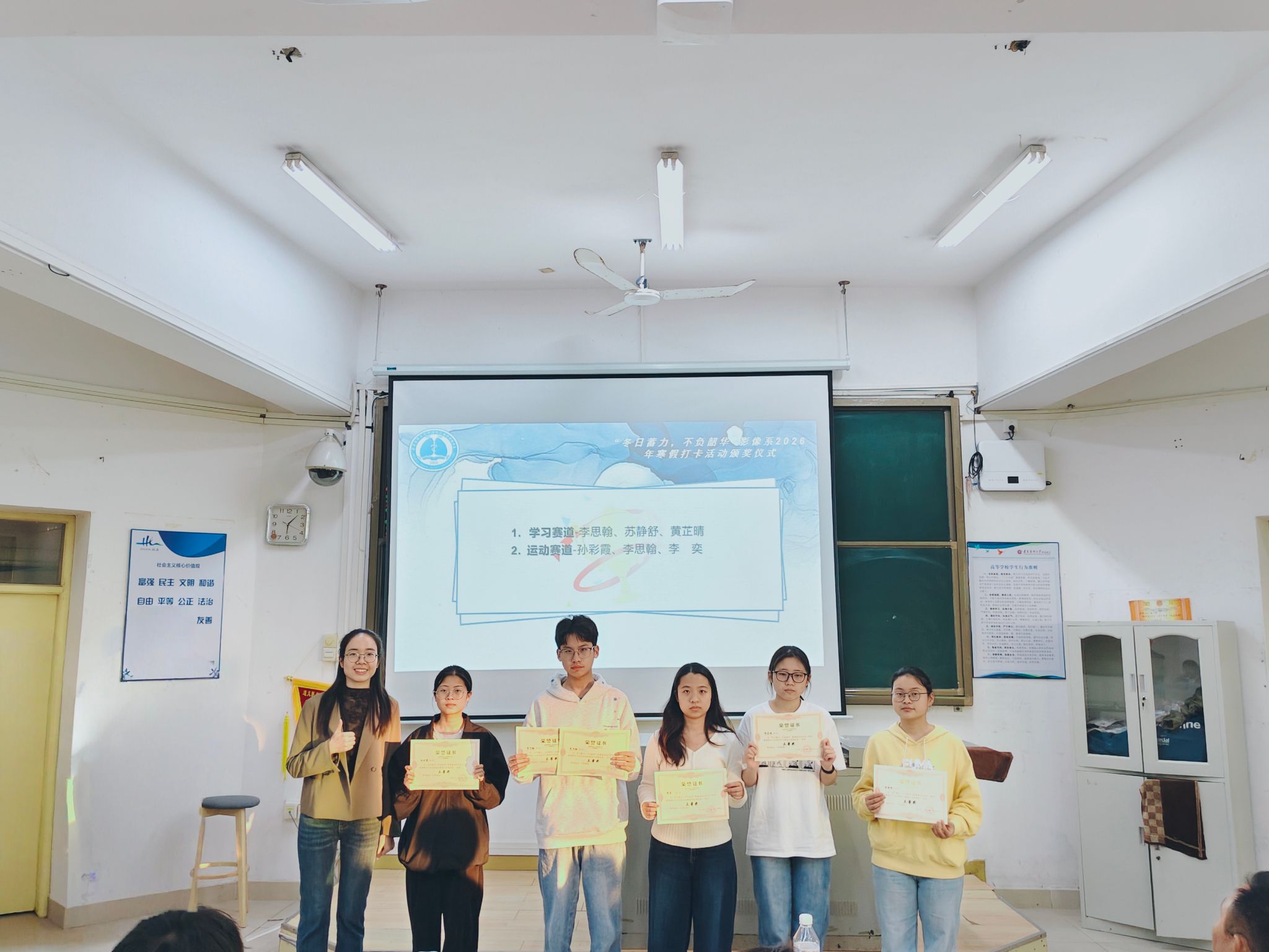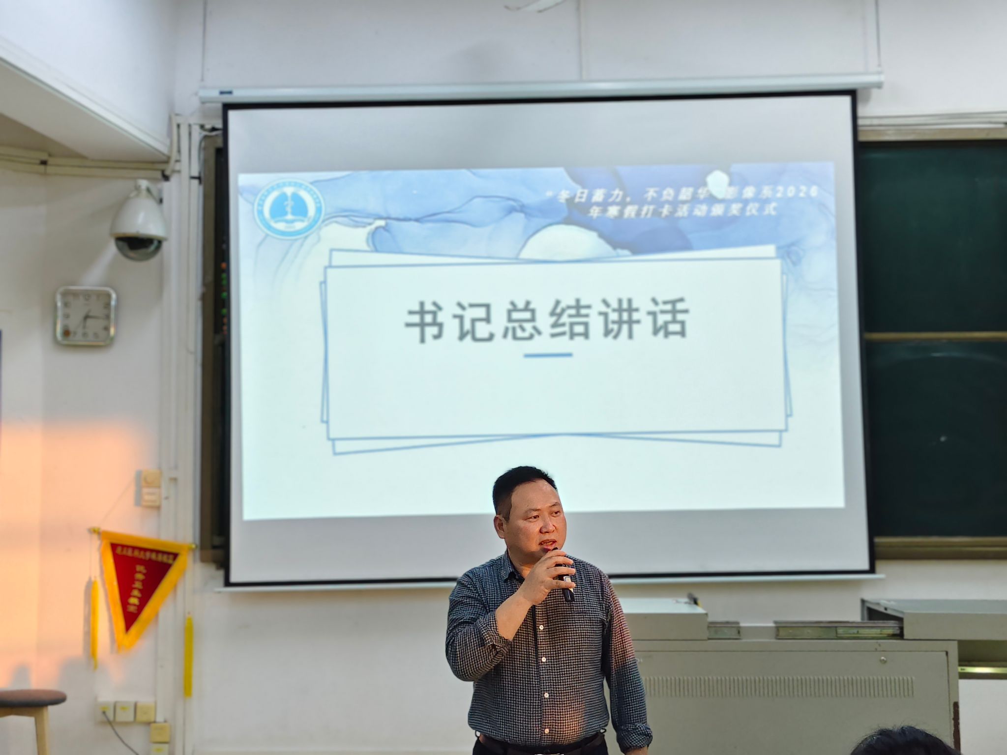 3月15日,寒假打卡活动圆满落幕,医学影像学系在教学楼301教室举行颁奖仪式,对在寒假打卡活动中表现优异的学生进行表彰,并邀请运动、学习、志愿服务等赛道表现优异的学生分享打卡经验。医学影像学系党总支副书记王强,专职辅导员钟仁云、蔡逸颖及医学影像学系全体在校生参与了此次颁奖仪式。