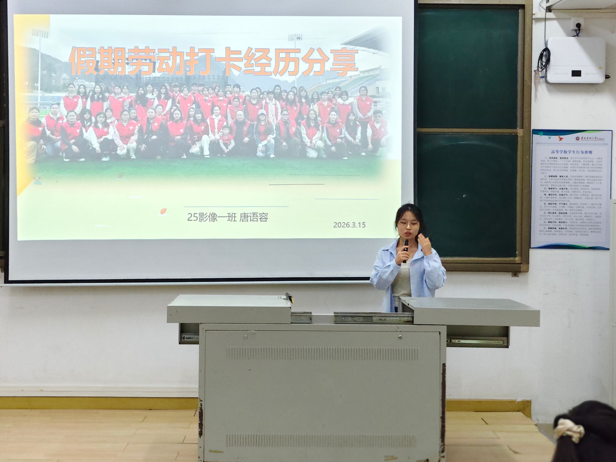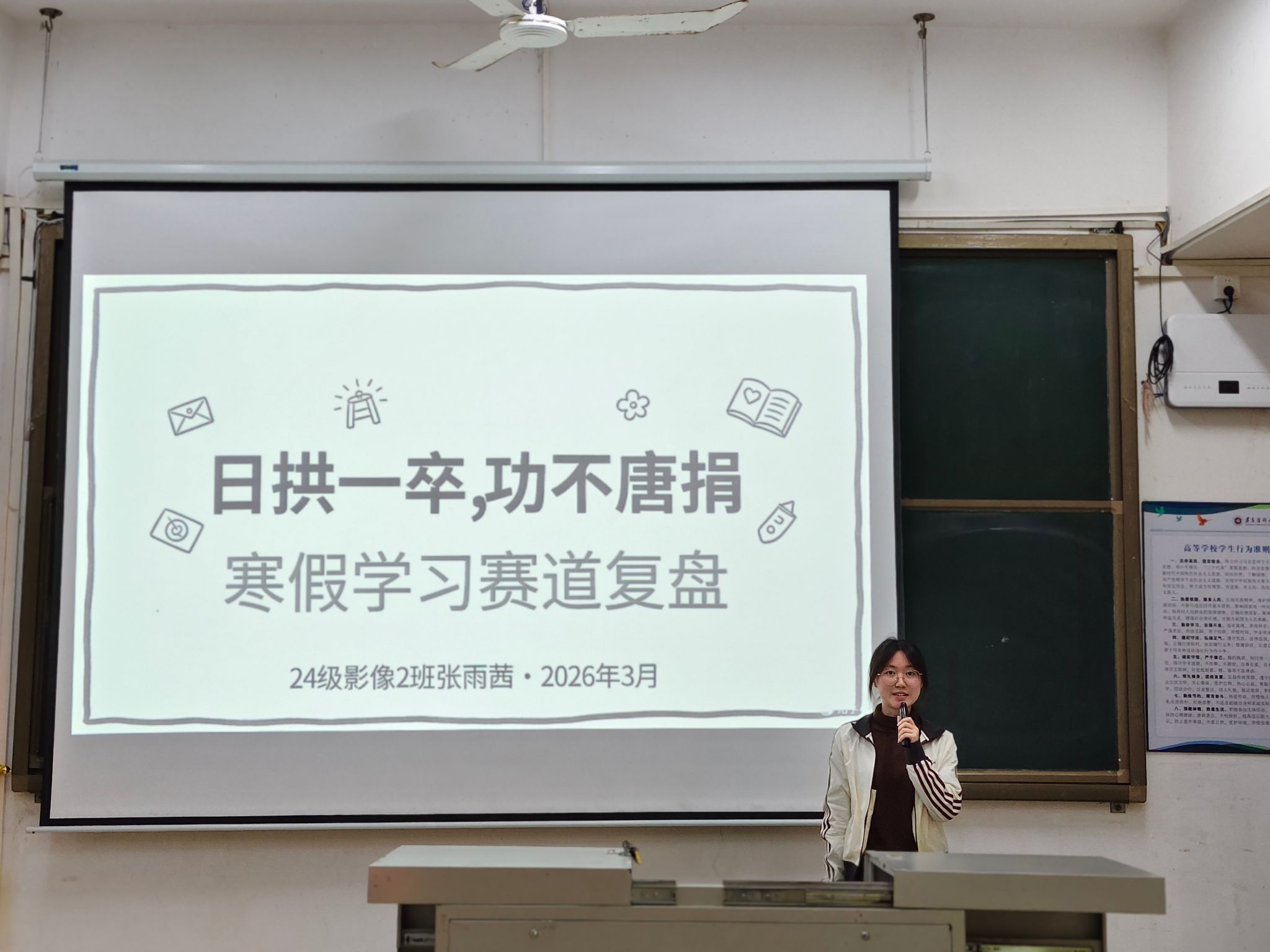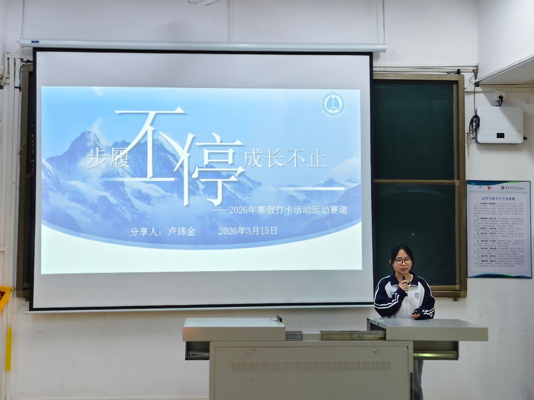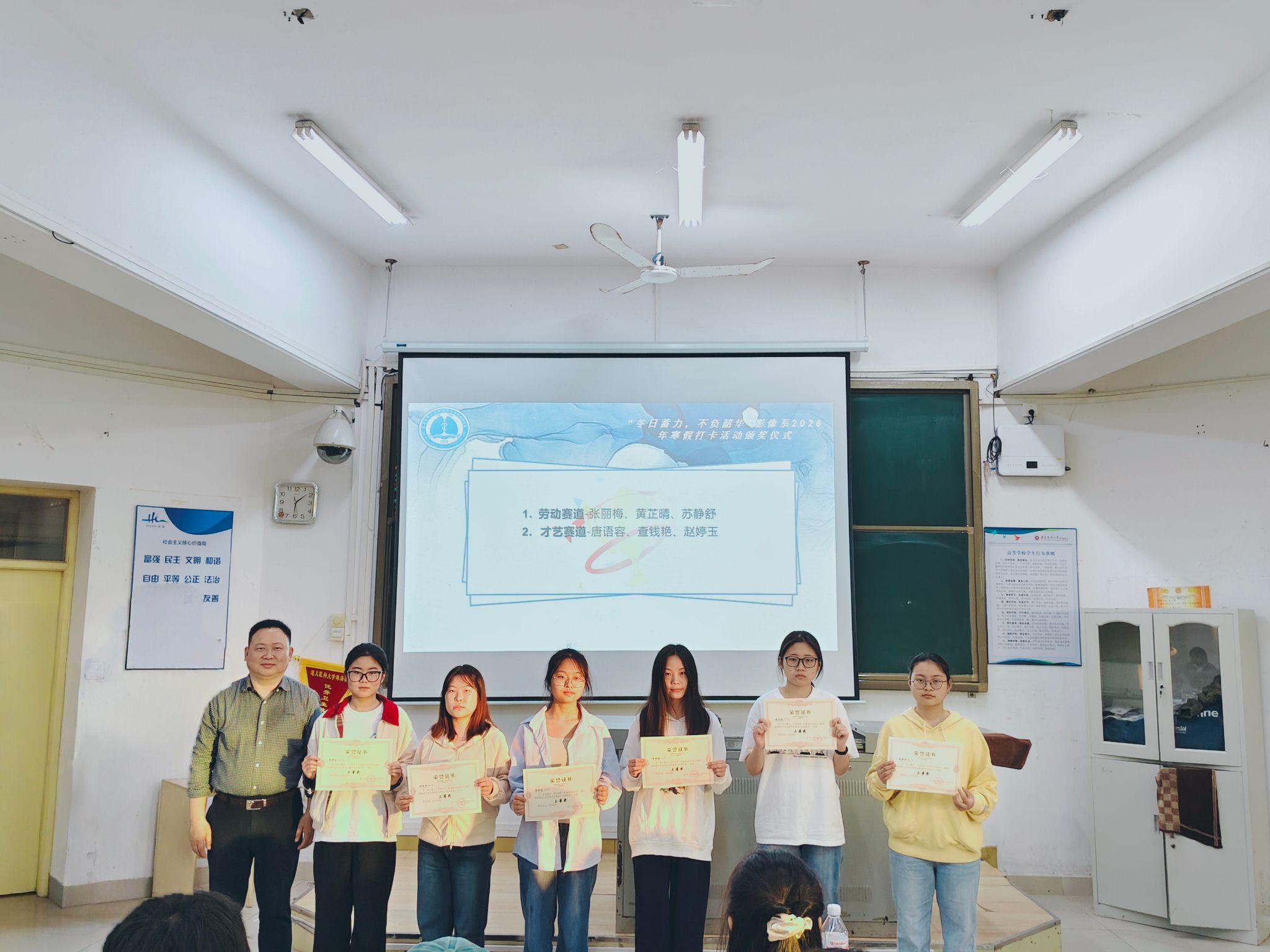 3月15日,寒假打卡活动圆满落幕,医学影像学系在教学楼301教室举行颁奖仪式,对在寒假打卡活动中表现优异的学生进行表彰,并邀请运动、学习、志愿服务等赛道表现优异的学生分享打卡经验。医学影像学系党总支副书记王强,专职辅导员钟仁云、蔡逸颖及医学影像学系全体在校生参与了此次颁奖仪式。