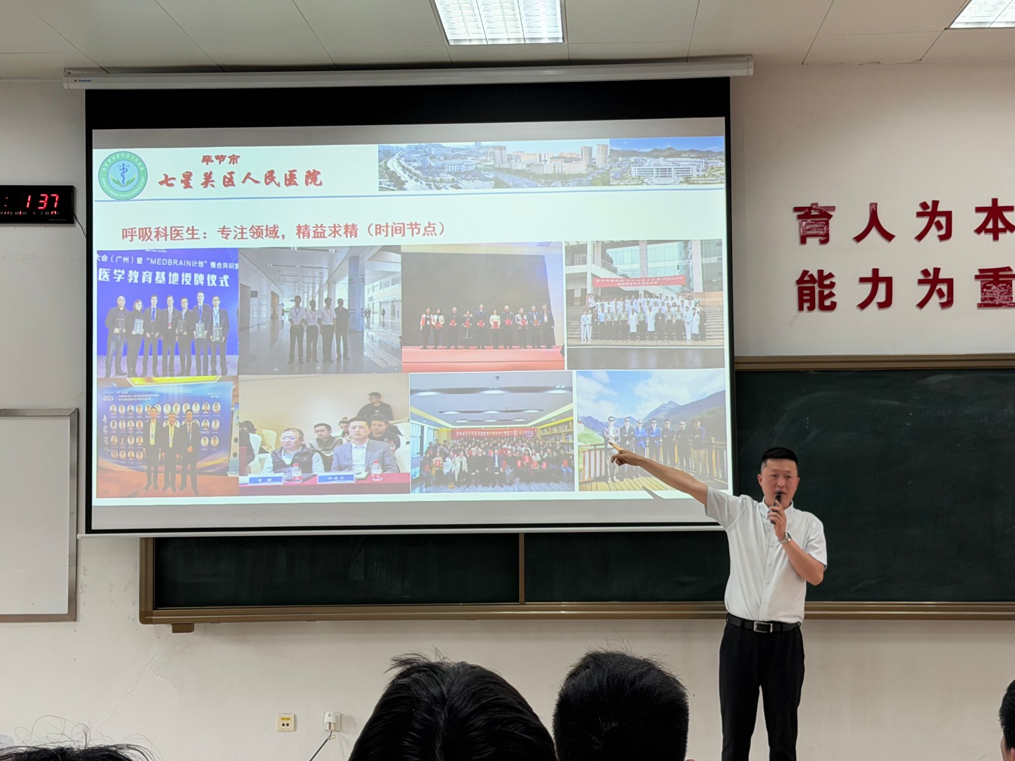 为充分发挥优秀校友的榜样作用,搭建交流平台,帮助在校生明晰学业发展与职业规划,引导树立正确的职业发展观,提升综合竞争力,助力学生成长成才,2026年4月11日上午,基础教学部于综合楼3104教室举办劳动教育系列专项活动——优秀校友交流分享讲座。本次讲座特邀2006级临床医学专业校友、毕节市七星关区人民医院党委委员、副院长胡建涛担任主讲人,两百余名学生参加。