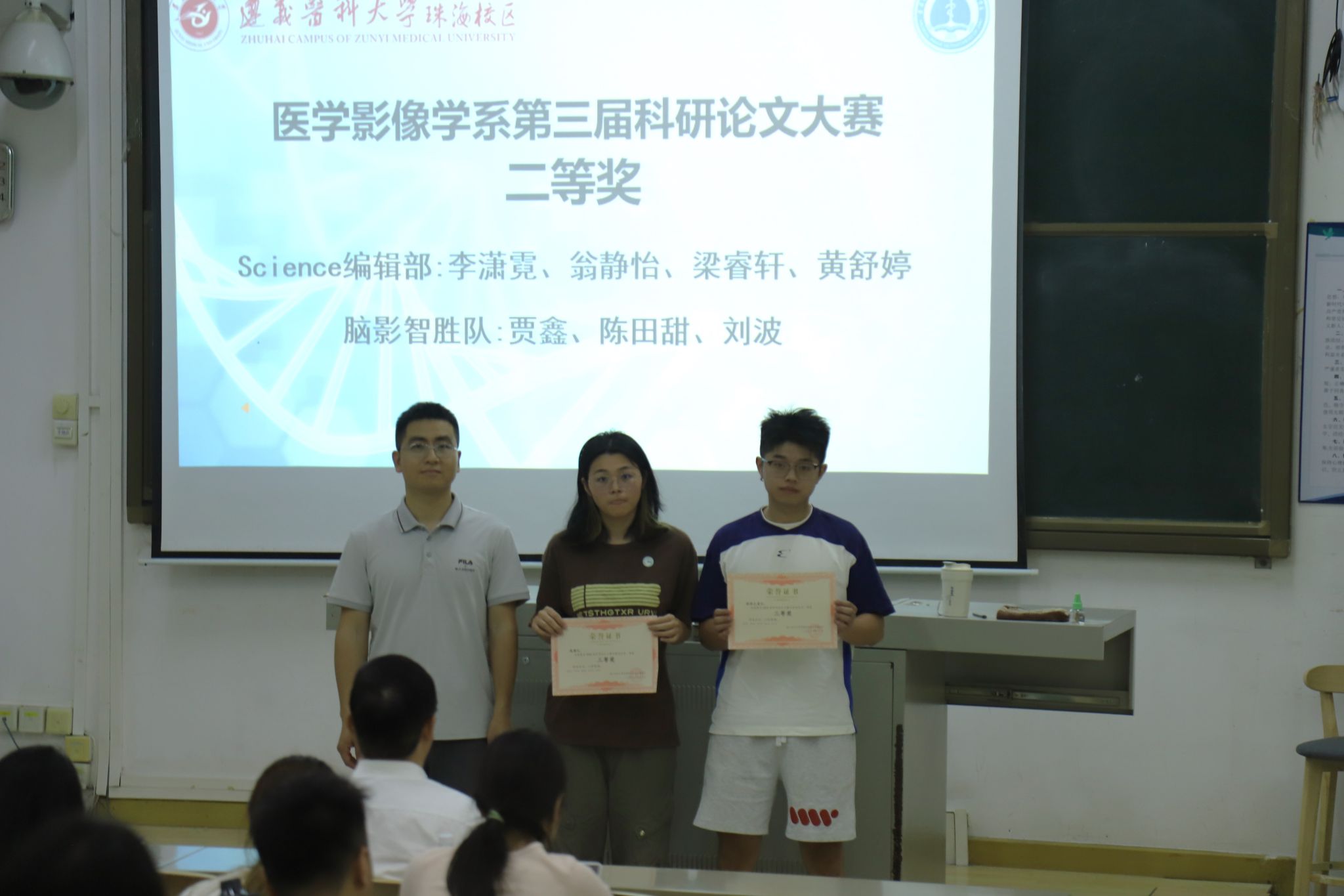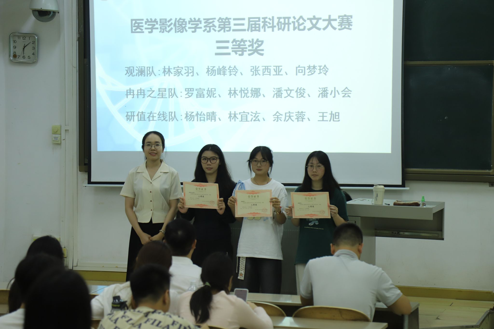 本次大赛由全体医学影像系学生自由组队参加,共22组队伍、50余人报名参赛。部系对参赛队伍的科研论文质量进行评定。经过严格、认真的评审,评选出一等奖1篇,二等奖2篇,三等奖3篇,优秀奖12篇。4月12日晚,第三届科研论文大赛颁奖仪式在教学楼301教室圆满举行。系主任陈昆涛教授,专职辅导员钟仁云、蔡逸颖出席了本次活动。