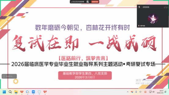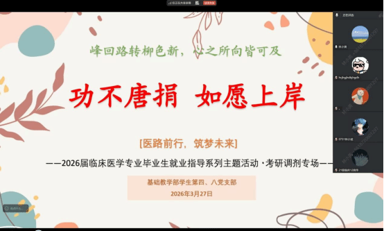 为精准提升2026届临床医学专业毕业生的升学与就业核心竞争力,助力学生明晰职业发展路径、从容应对升学就业关键挑战,切实打通就业服务“最后一公里”,基础教学部精心策划并顺利开展“医路前行,筑梦未来”就业指导系列主题活动。活动围绕考研复试指导、住院医师规范化培训(以下简称“规培”)指导等核心环节,分系列场次有序推进,累计覆盖 700 余人次,为毕业生提供全方位、全流程、一站式精准就业支持。