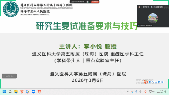 3月6日,系列活动首场考研复试专场以线上形式正式启动。遵义医科大学第五附属(珠海)医院重症医学科主任李小悦教授受邀作《研究生复试准备要求与技巧》专题讲座,系统梳理复试流程、详解面试技巧、分享心态调适方法,为同学们搭建清晰备考框架。