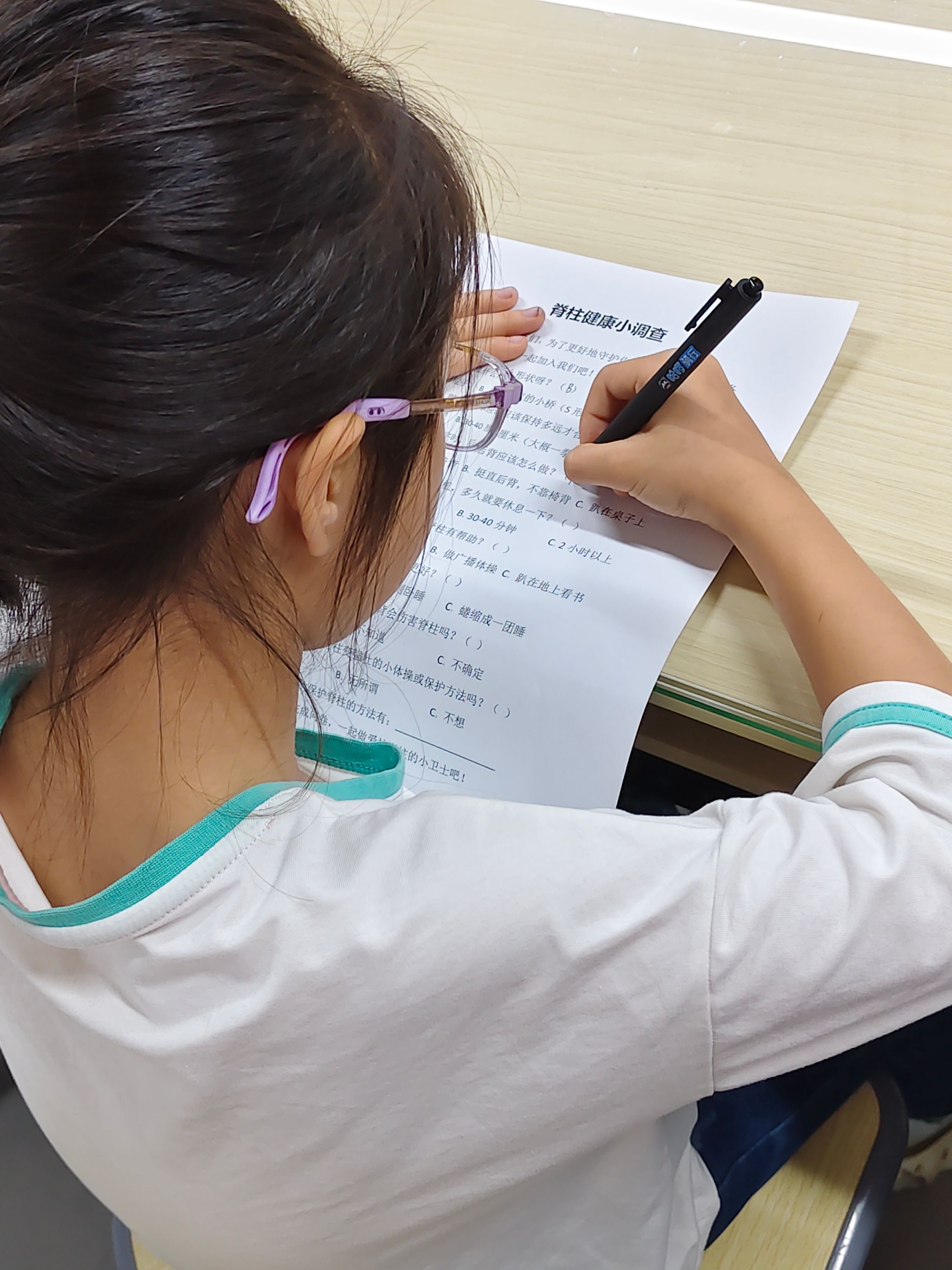 活动后期,志愿者组织孩子们排队并以“小彩蛋”的方式使用专业脊柱测量工具,逐一为孩子们进行脊柱侧弯筛查,详细记录体态数据,并结合个体情况给出其针对性的姿势调整建议。