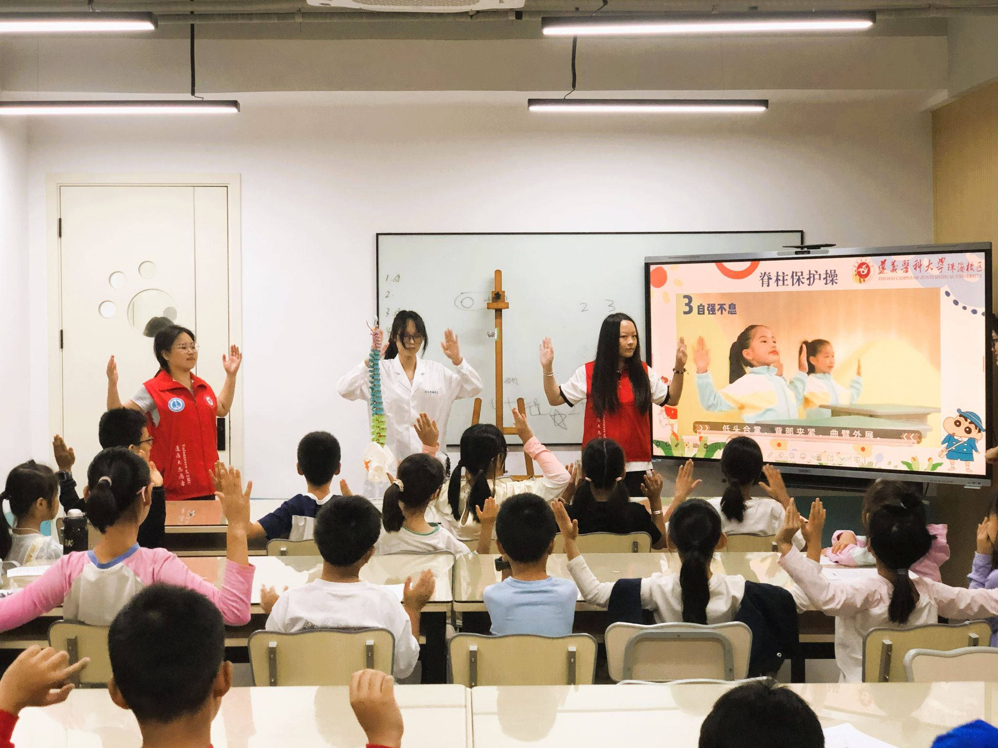 4月25日,由校区团委主办的“‘脊’往开来——脊柱健康关爱计划”志愿服务活动在珠海市金湾区少年宫顺利举行。医学影像学系团委、医影随行志愿服务队与珠海市金湾区少年宫联合承办,15名校区医影随行志愿者为现场25余名青少年带来脊柱健康科普与实践指导。