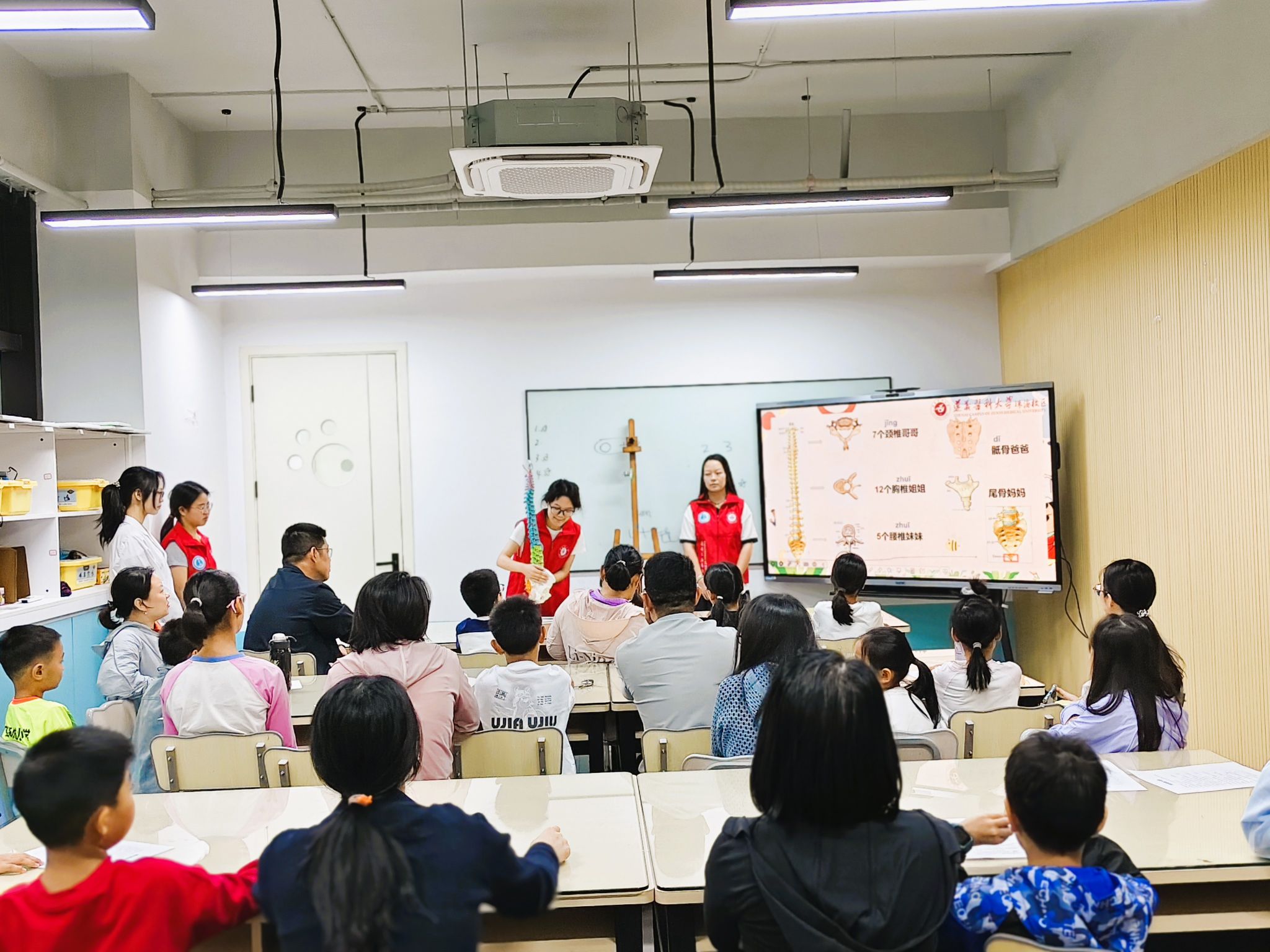 活动伊始,志愿者借助彩色脊柱模型,分部位讲解颈椎、胸椎、腰椎等结构。将庄严的脊椎骨赋予人格化的昵称——“7个颈椎哥哥、12个胸椎姐姐”,配合“骶骨爸爸和尾骨妈妈”的家族设定,帮助孩子们理解,同时展示脊柱侧弯类型示意图,通过对比明确侧弯视觉特征。针对青少年“跷二郎腿、趴桌写作业”等日常不良姿势,志愿者们结合真实案例演绎“打败‘歪歪怪’”情景剧,直观说明其对脊柱发育的影响,细致介绍脊柱侧弯早期表现及危害,帮助青少年建立基础的脊柱健康认知。