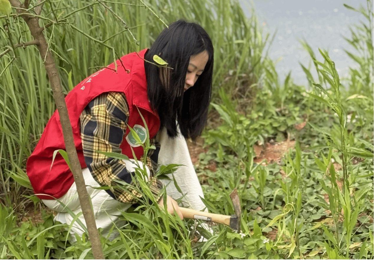 随后,同学们在药用植物园内有序展开劳动。同学们蹲在苗圃间,小心翼翼地拔除缠绕在药用植物根部的杂草,避免伤及药苗。虽然天气渐热,但大家热情不减,在泥土与药香中挥洒汗水。