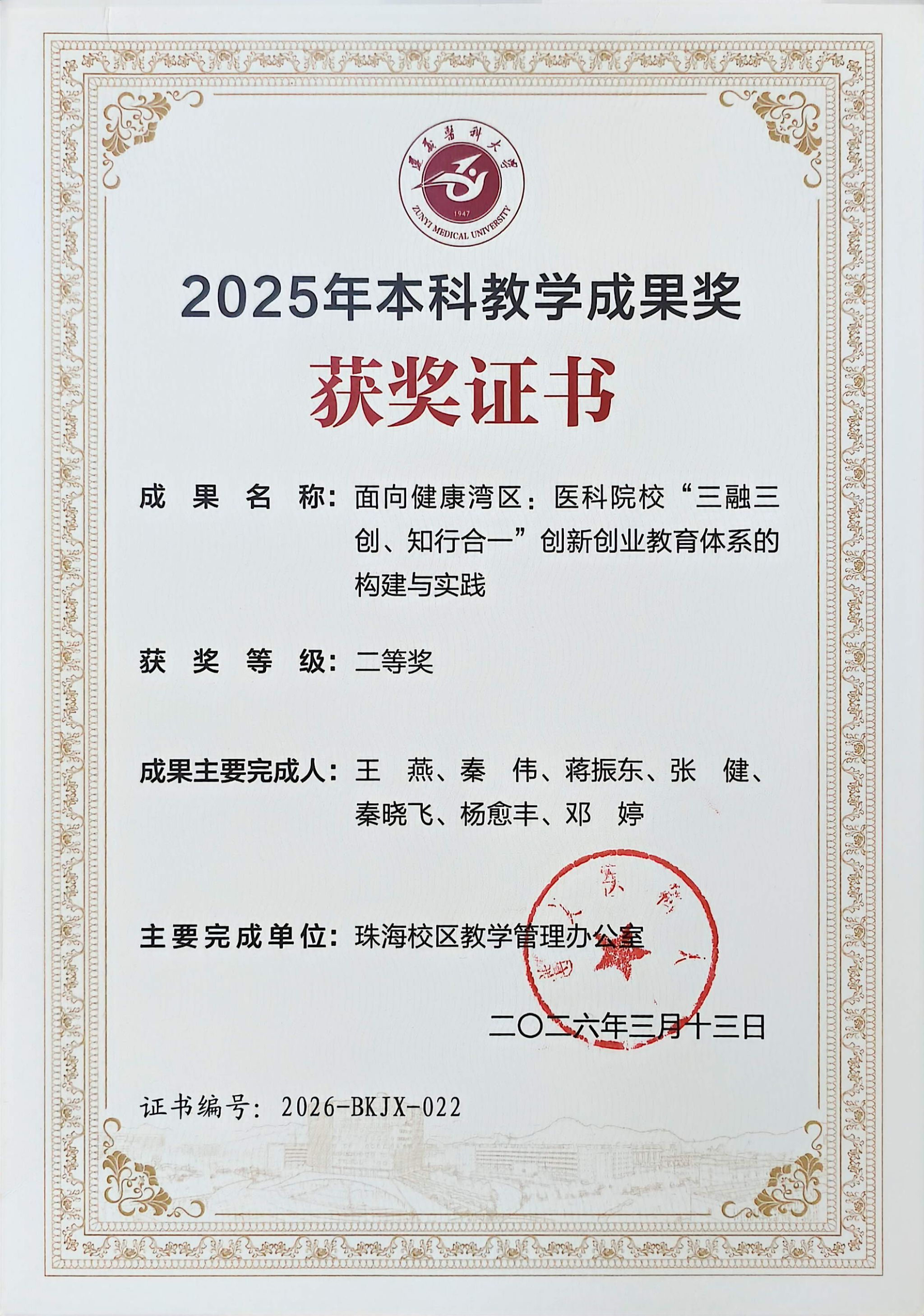 近日,遵义医科大学公布教学成果奖评选结果,王燕副教授主持的教学成果《面向健康湾区:医科院校“三融三创、知行合一”创新创业体系的构建与实践》荣获校级教学成果二等奖**。该成果聚焦新时代医科院校创新创业教育改革,结合粤港澳大湾区健康产业发展需求,系统探索了创新创业教育与专业教育、实践教学、社会服务深度融合的新路径,具有较强的示范推广价值。