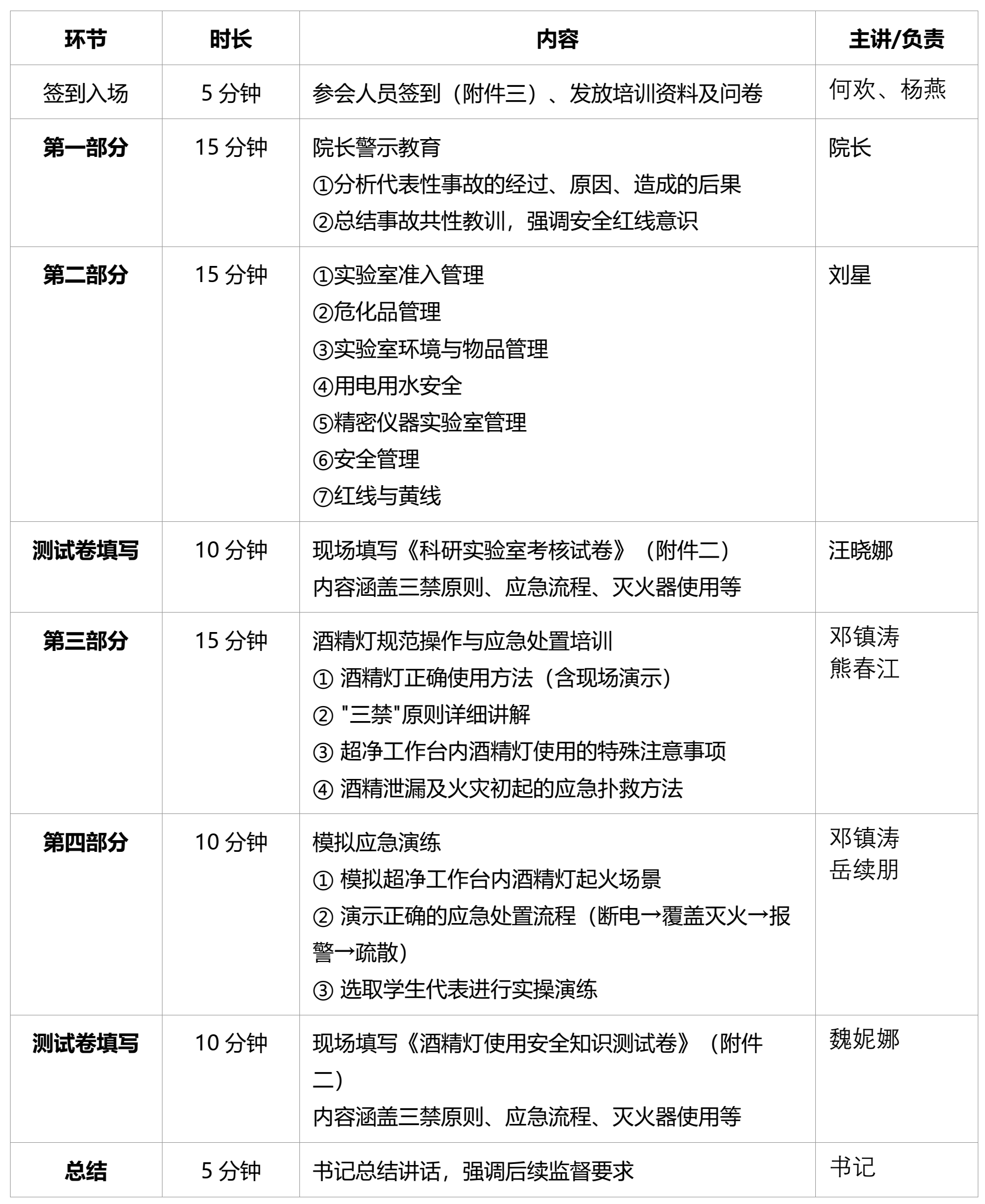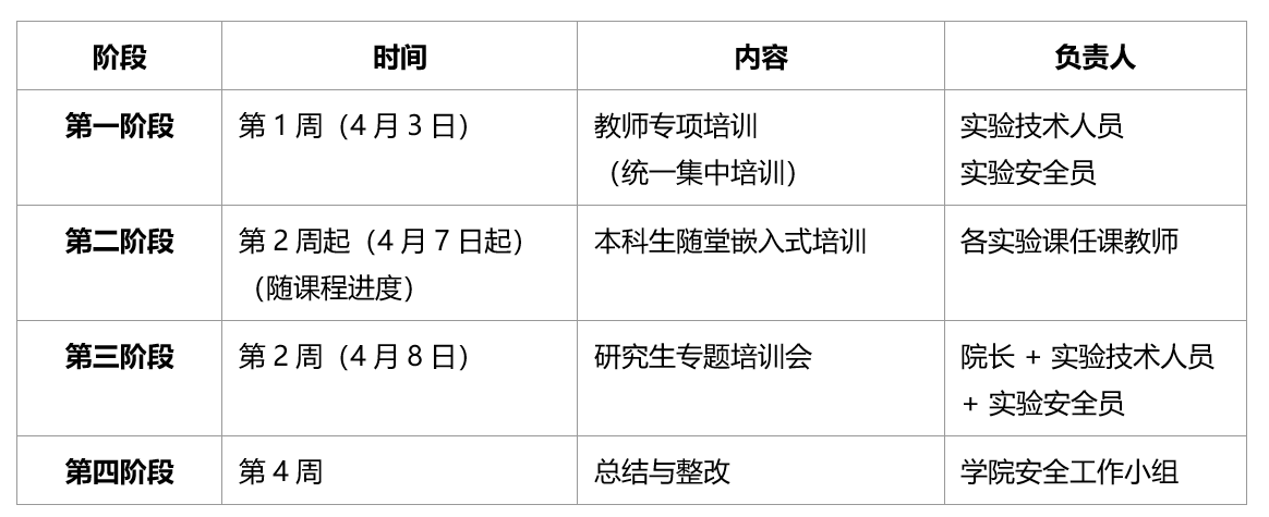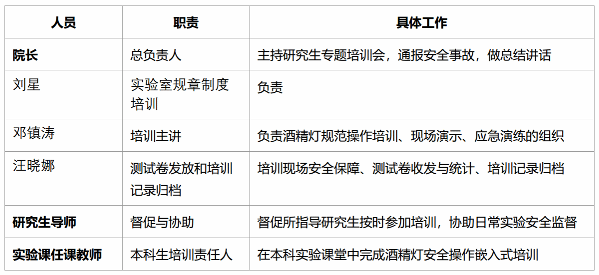 本次活动由学院实验室安全工作小组统一组织实施,相关人员分工如下: