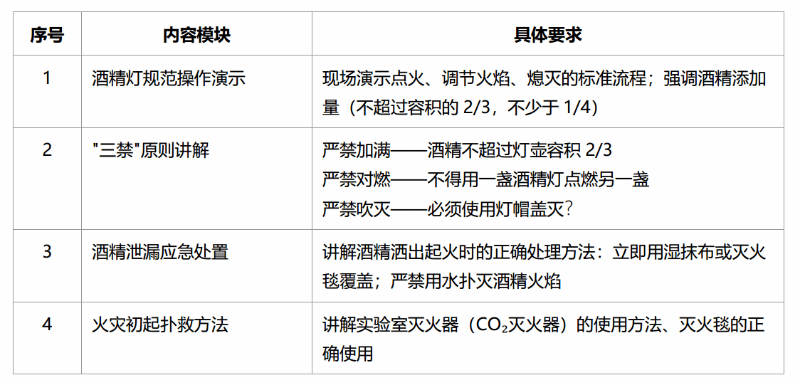 在每学期首次涉及酒精灯的实验课上完成安全培训讲解。