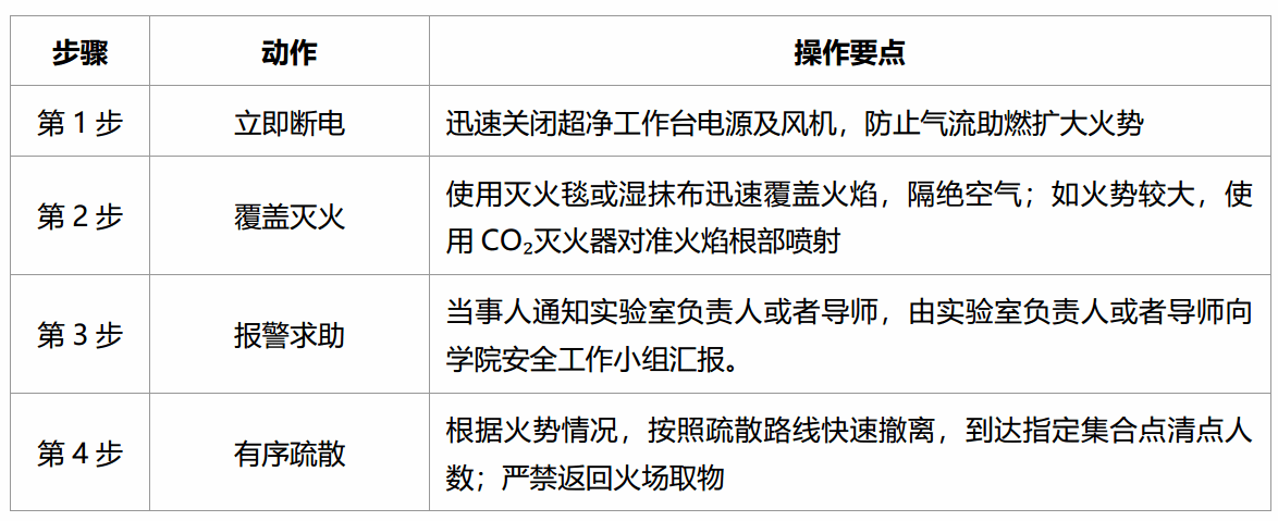演练目标:使研究生掌握超净工作台内酒精灯意外起火后的标准应急处置流程。