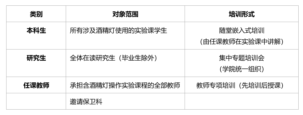 在所有涉及酒精灯使用的本科实验课程中,由任课教师在首次使用酒精灯的课堂上,专门安排10分钟进行酒精灯安全操作讲解与示范。