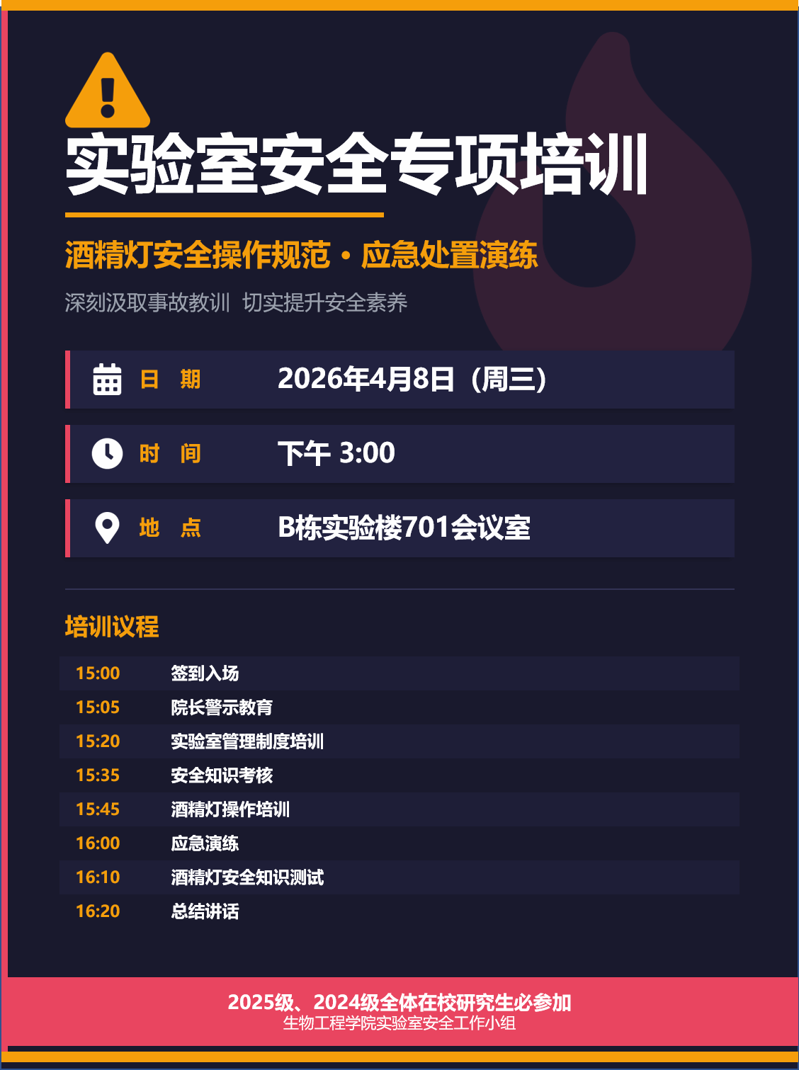 本次活动旨在全面普及酒精灯安全操作规范,强化师生"三禁"意识;通过案例警示教育,提升风险识别与防范能力;通过实操演练,掌握酒精泄漏及火灾初起的应急处置方法。