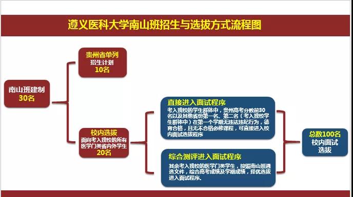 2021年,“南山”班继续招生,由钟南山院士任总导师,实施小班制教学,开展海内外学习交流,实行双导师制,单设钟南山奖助学金,学生毕业后达到南山班推免资格条件者100%推免硕士研究生。南山班初始建制30人,其中贵州省一本批次单列计划招生10人,其余人选在新生入校第一学期后,从省内外2021级医学门类专业优秀学生中选拔产生。校内选拔过程中,贵州省高考分数前30名以及其他省份第一名、第二名(考入我校的学生群体中)在第一个学期如无违法违纪行为,德育合格,且无不及格必修课程,可直接进入校内面试选拔程序;其余考入我校的医学门类学生,按照南山班遴选文件,综合高考成绩及学期成绩,择优选拔进入面试程序。