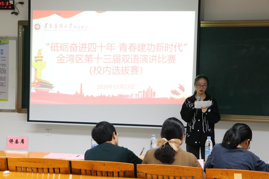 为深入学习宣传贯彻习近平新时代中国特色社会主义思想,引导我校大学生在推动珠海经济特区“二次创业”加快发展中作出积极贡献,同时进一步推广普通话和英语的应用,给我校大学生提供锻炼自我、展示风采的平台。由校区团委指导,校区学生会主办的以“砥砺奋进四十年 青春建功新时代”为主题的双语演讲校内选拔赛于2020年11月23日晚19:00在综合楼3203教室顺利举行。参与此次比赛评分的评委有梁瑾、程霄、金立元老师。