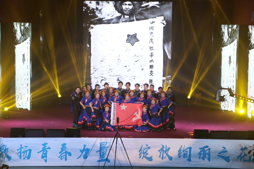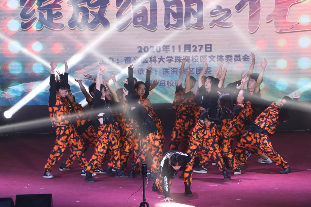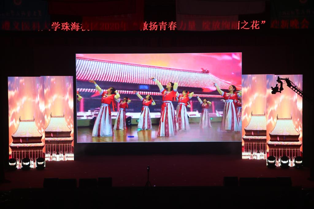 晚会伊始,开场视频展示了2020级新生军训的精彩瞬间,随后器乐队的同学们带领全体师生挥舞旗帜,高声歌唱“红旗飘飘”,诚挚的向祖国表述最美好的祝愿。本次晚会形式多样,有歌曲、舞蹈、朗诵、乐器演奏等:校区工会的武术表演《功夫扇》,武风华绎心志;五附院带来的舞蹈《出水莲》体现医者之志;器乐队带来《你的答案》与抗疫息息相关,彰显医者爱国决心;民族舞蹈队的节目《纸扇书生》书生意气舞于纸扇之中;民乐队带来的民族乐器表演《我的祖国》、《赛马》激昂有力气势恢宏,将全场气氛推向高潮;主持队带来的朗诵《恪守医心,抗疫同行》表达了对医者的感激之情。本次晚会首次与新蒲校区同步连线,并采取了网络5G VR直播方式全网直播,让远在遵义的同学欣赏到了来自珠海校区充满民族风情的侗族大歌《最美的等候》、炫酷又充满活力的街舞《Tiger》还有展现彝汉两族血浓于水的民舞《守护》,同时珠海校区的同学也远程欣赏了新蒲校区同学们的优秀表演。