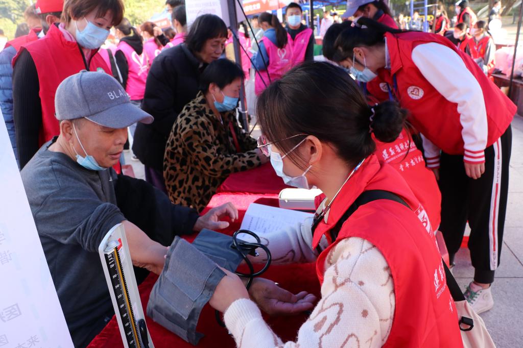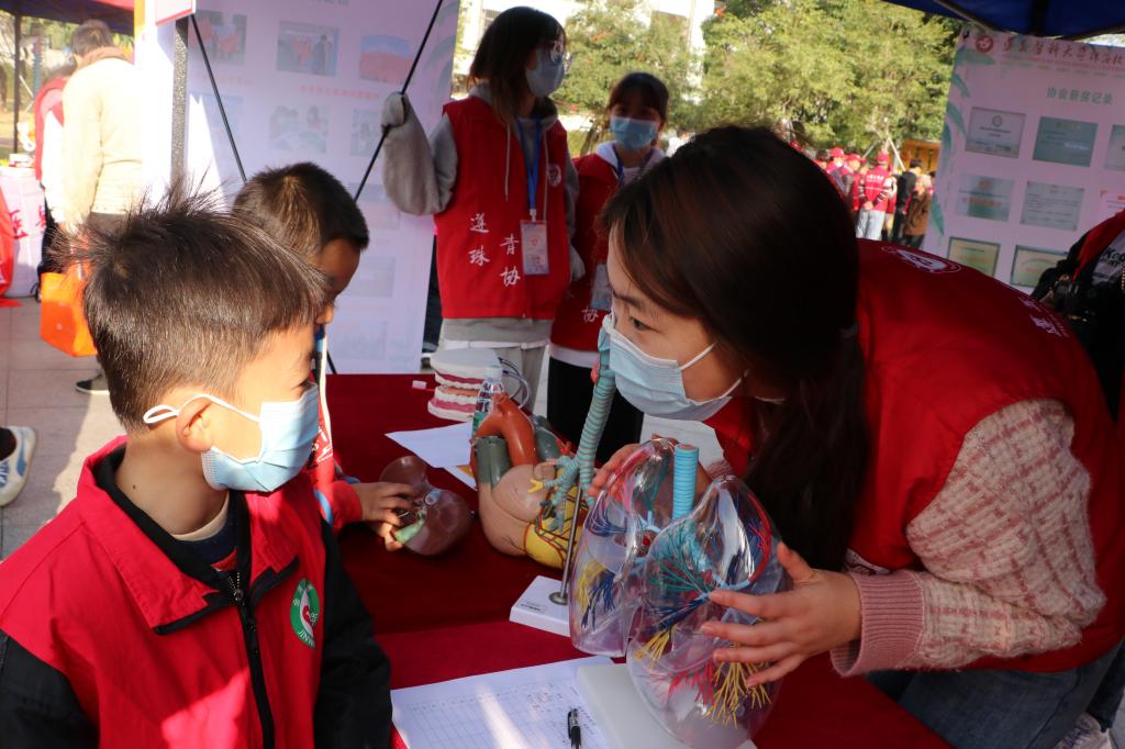 活动由手语表演《在你身边》拉开序幕,随后主持人介绍本次活动背景和出席活动的嘉宾,紧接着宣读《2019-2020年度珠海市金湾区志愿服务工作先进集体和先进个人》名单。其中,校区青年志愿者协会被评为珠海市金湾区“十佳志愿服务组织”;校区百千万志愿者结核病防治知识传播行动项目被评为珠海市金湾区“十佳志愿服务项目”;陈忠政同学被评为珠海市金湾区“十佳志愿者”;何衍、杨建磊、廖恩梅、郑洁、王克永、郭洁等六位学生志愿者被评为珠海市金湾区“优秀志愿者”。我校7个村居志愿服务培育扶持项目的志愿者都参加了活动,他们包括: “我与鱼林共成长”志愿服务伙伴计划、急救知识普及系列活动、健康宣传进村居、垃圾分类,生态村居、“以爱助梦,携手揽坑爱心行”义教陪伴活动、青少年脊椎保护行动和人体奥秘系列课程。其中,“我与鱼林共成长”志愿服务伙伴计划小组为现场咨询人员讲解慢性病、传染病、基础医学等知识;“急救知识普及系列活动”小组现场演示“叫叫CAB”急救技能培训等急救方法;“健康宣传进村居”小组为现场咨询人员进行基础体检;“垃圾分类,生态村居”小组以游戏的方式宣传垃圾分类知识等。还有其他队伍在进行口腔健康宣讲、测量儿童脊椎侧弯度、人体奥秘探索、艾滋病知识宣传等活动。期间,校区团委书记杨泽寅老师和校区团委专职团干李希老师到达活动现场,问候志愿者们并提出相关服务建议。在校区志愿服务备受好评的同时,校区民舞队的舞蹈《纸扇书生》引得现场一片欢呼。活动最后,各志愿服务组织合影留念。活动至此圆满结束。